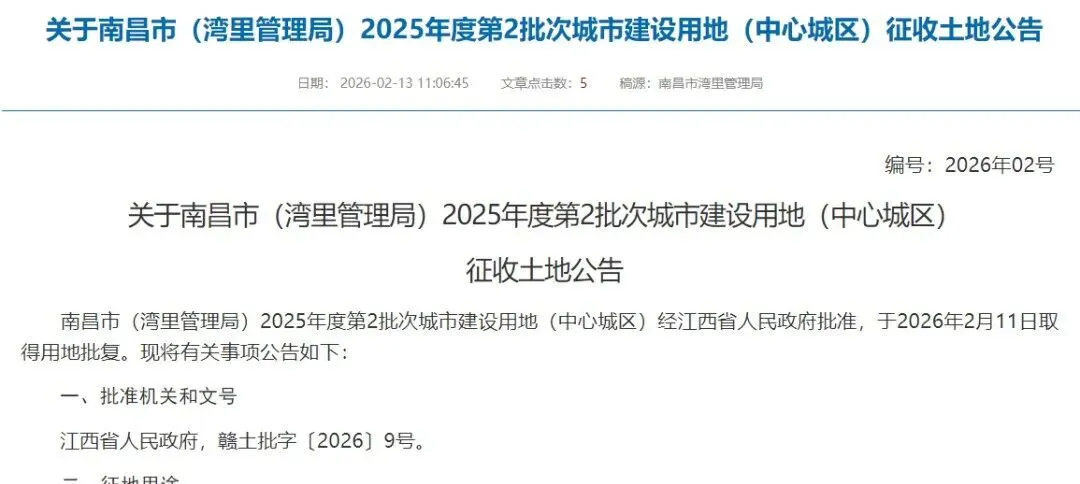南昌市(湾里管理局)2025年度第2批次城市建设用地(中心城区)经江西省人民政府批准,于2026年2月11日取得用地批复。