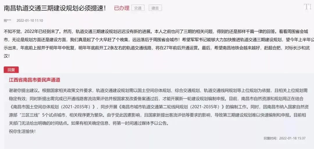 “不知不觉,2022年已经到来了。然而,轨道交通三期建设规划迟迟没有新的进展。本人之前也问了三期的相关问题,得到的还是那样千篇一律的回答。看看周围省会城市,无论是规划方面还是建设方面,我们真是起了个大早赶了个晚集,远远落后于周围省会城市!希望能够大力加快推进轨道交通三期建设规划,望今年上半年公示出来,年底前上报并于明年年中批复,明年年底前开工2条左右的轨道交通线路,将在27年前后开通运营。最后,希望南昌地铁会越来越好,赶超合肥,对标长沙和武汉!”
