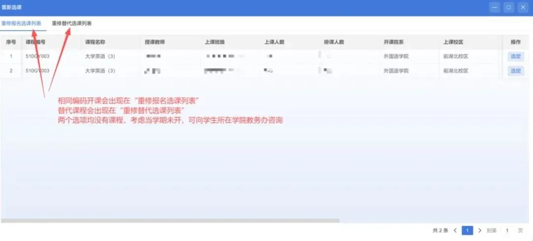 选课期间开放部分公共基础课及专业课选课,学生可选择调整必修课程所属班级,以避免补修课程冲突,但请多次核对课表避免各种操作失误导致的漏课。