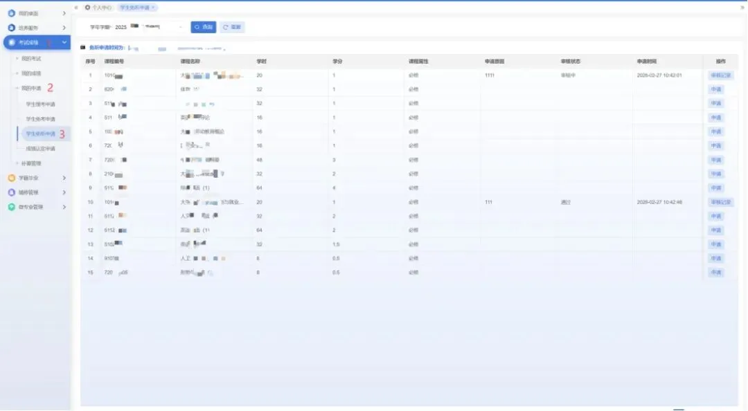 3.免听需由学生本人在教务管理系统中申请,申请流程为:通过南昌大学门户系统登录本科教学服务平台→进入“考试成绩”→点击“我的申请”,针对对应课程发起“申请”“保存”之后要点击“送审”完成申请。学生申请之后,需及时提醒任课教师、学生所在学院教务办进行审核。