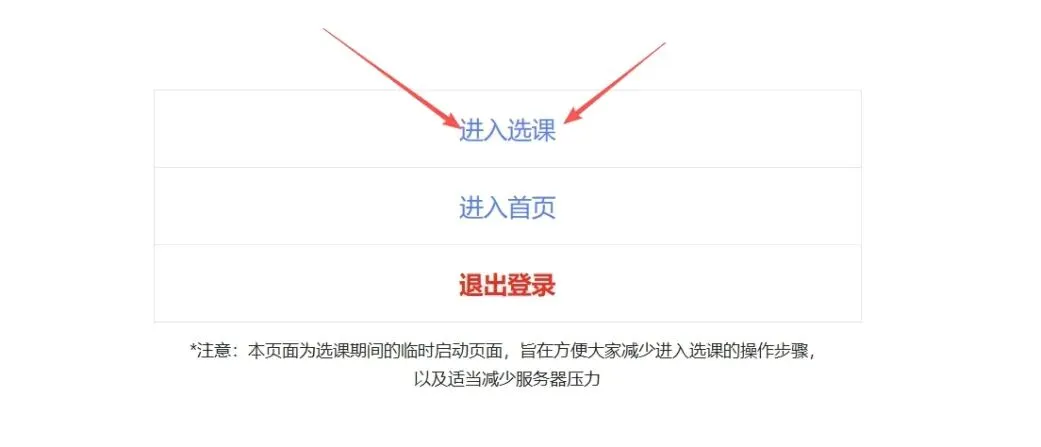 集中选课期间会跳出直通选课页面。选课开始后两小时会暂时关闭学生端首页,如需查询其他业务,请务必在选课开始1小时前或开始2小时后进行。