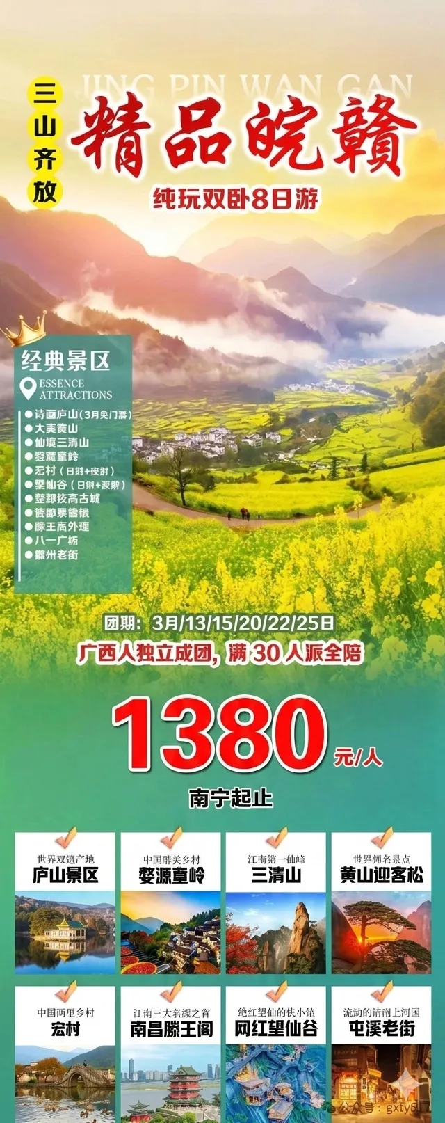 >南昌、庐山、黄山、宏村、篁岭、望仙谷、水墨上河、三清山、景德镇双卧八日游