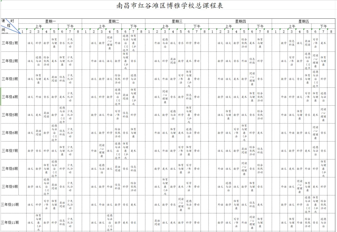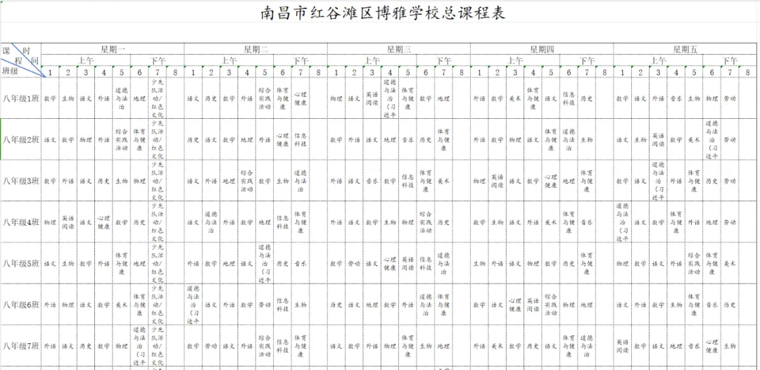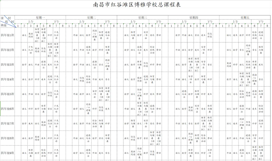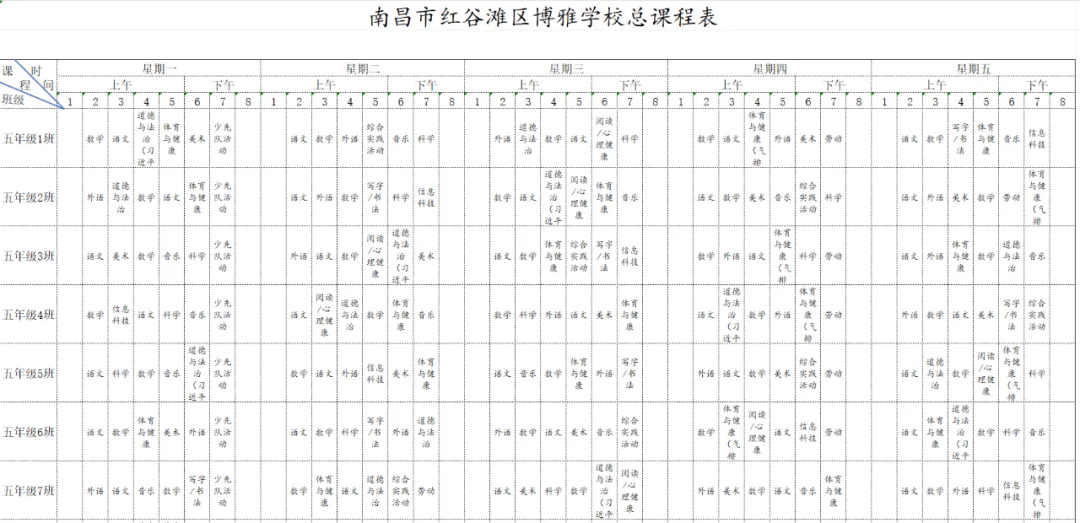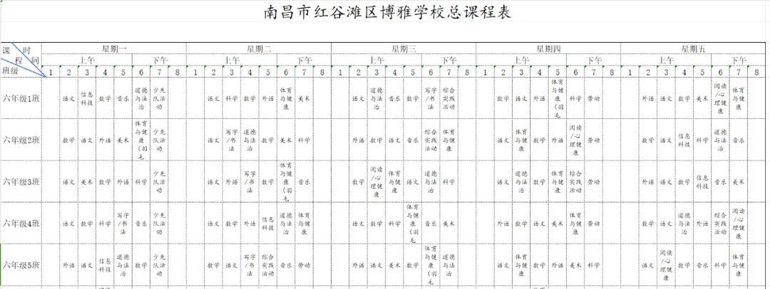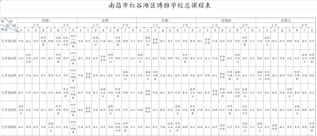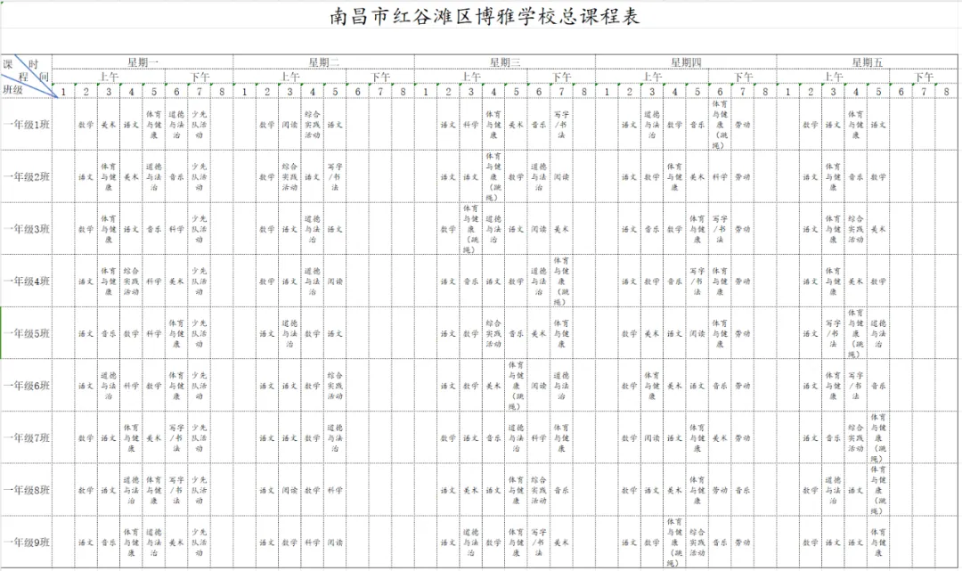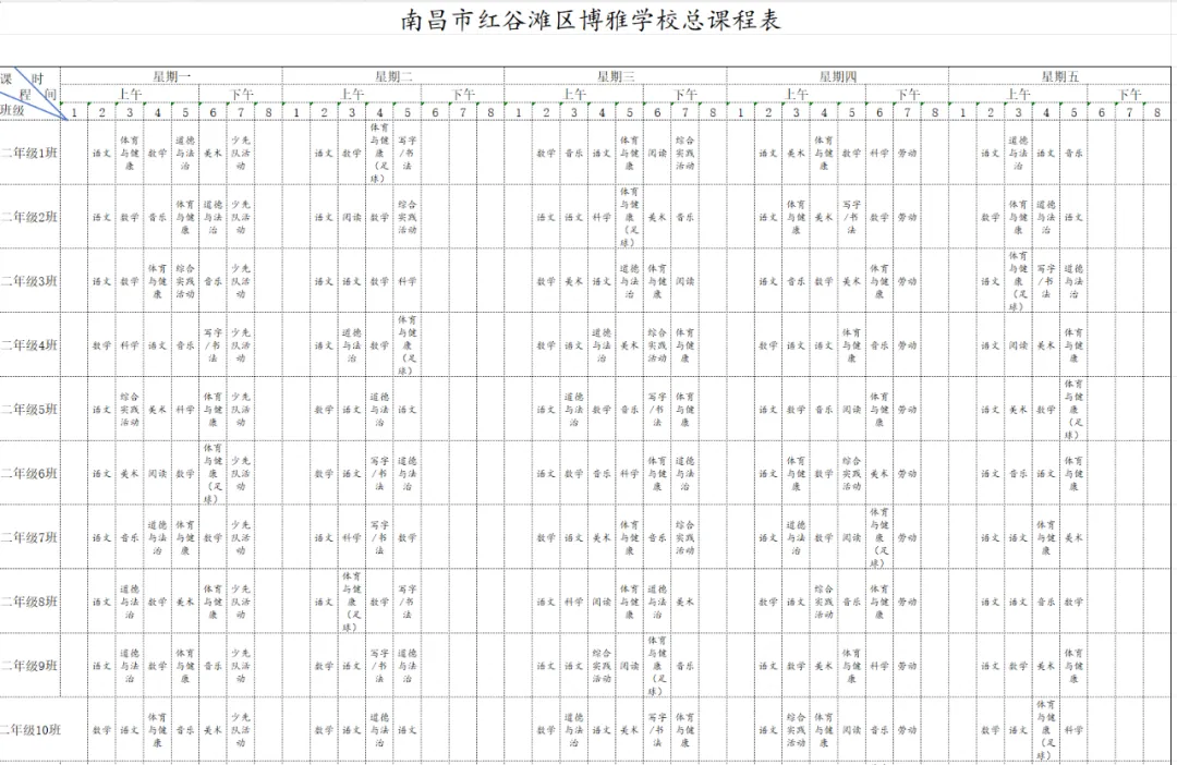 为深入贯彻国家教育方针,全面落实省、市、区关于新时代学校体育、美育、劳动教育及义务教育阶段校内课后服务的各项工作部署与文件要求,严格执行《中共江西省委 江西省人民政府关于全面加强新时代大中小学劳动教育的实施意见》《中共江西省委办公厅 江西省人民政府办公厅印发<关于全面加强和改进新时代学校体育工作的实施方案>和<关于全面加强和改进新时代学校美育工作的实施方案>的通知》等相关规定,我校始终坚持以生为本,紧扣五育并举育人目标,坚守体育、美育、劳动教育课程开设刚性要求。严格遵循国家课程方案和课程标准,结合南昌二中九龙湖校区(红谷滩区博雅学校)办学实际与学生成长需求,科学规划、系统编排2026年春季学期课程,确保国家规定课程开齐、开足、上好,切实将课程育人落到实处,以规范的课程设置夯实教育教学根基,促进学生德智体美劳全面发展、健康成长。