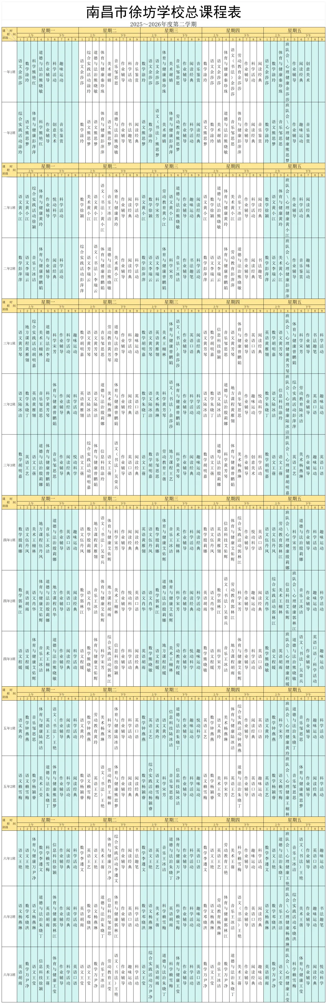 为深入贯彻落实中办、国办《关于全面加强和改进新时代学校体育工作的意见》、《关于全面加强和改进新时代学校美育工作的意见》、《关于全面加强和改进新时代学校劳动教育工作的意见》和省教育厅关于“晒课表”相关文件精神,严格落实学校体育、美育、劳动教育课程开设的刚性要求,按照国家课程方案和课程标准,开齐开足,上好体育、美育、劳动教育课。结合我校教育教学实际,特在学校微信公众号平台“晒课表”(2025-2026学年第二学期),并接受社会监督。