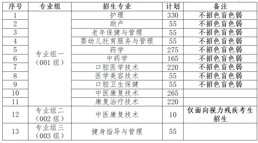3.护理、助产、老年保健与管理、婴幼儿托育服务与管理、药学、中药学、口腔医学技术、医学美容技术、口腔卫生保健专业不接受色盲、色弱考生。