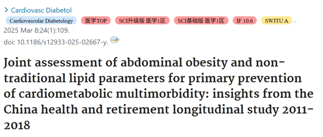 中文标题: 腹部肥胖与非传统脂质参数联合评估,用于心血管代谢多病的初级预防:摘自2011-2018年中国健康与退休纵向研究的见解
