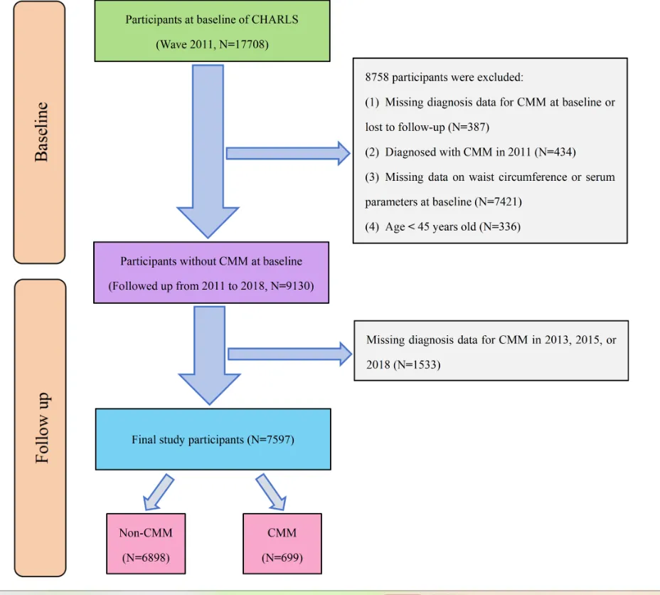 排除标准包括:基线已有CMM、缺失关键数据、年龄<45岁、失访等。