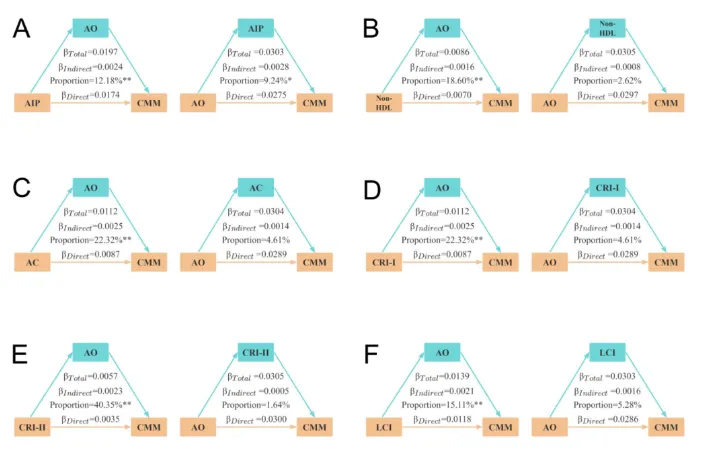 腹部肥胖显著中介了非传统血脂参数与CMM之间的关系,中介比例从12.18%到40.35%不等。
