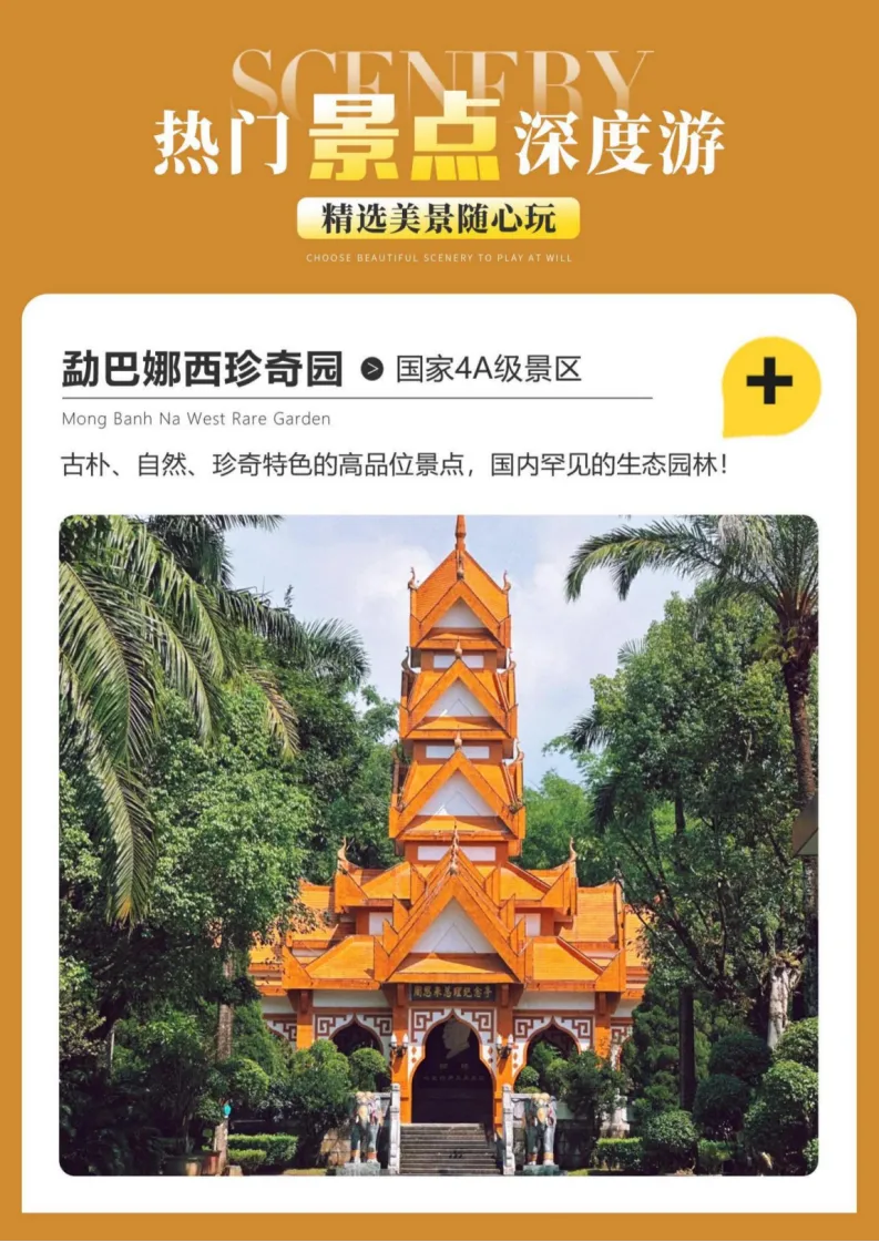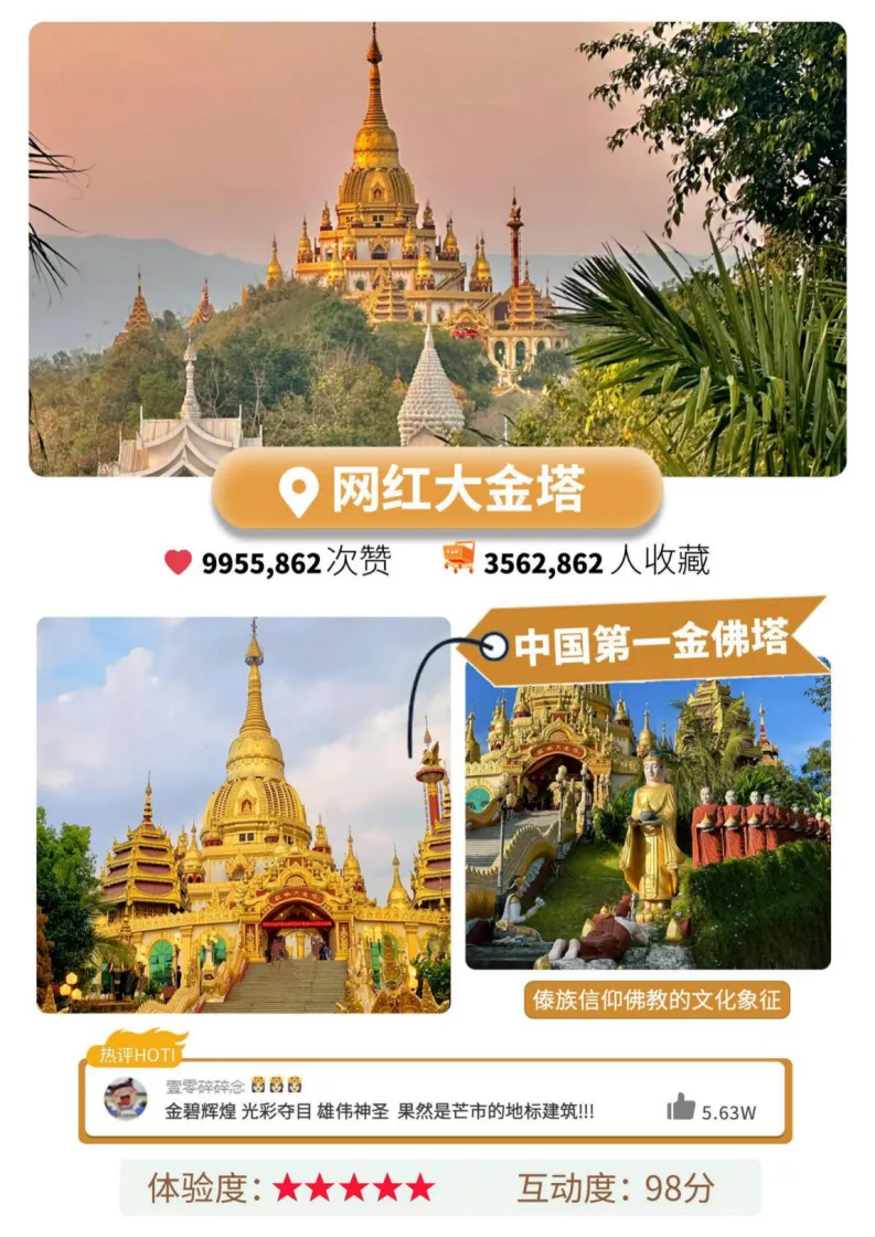 早餐后,游览《捉妖济3 人妖殊途》的拍摄地【勐焕大金塔】,大金塔是中国第一金佛塔,亚洲第一空心佛塔,作为芒市的标志性建筑, 傣族信仰佛教的文化象征,有着深厚的民族文化内涵 是生活在这里的傣族人民的圣地; 游览【勐焕大银塔】和大金塔可以说是两座相互陪衬, 彼此互补的佛塔。它们坐落在相邻的两座山峰,金光闪闪 ,银色灿灿。它们都属傣式佛塔,外形酷似, 大金塔属空心佛塔,大银塔属实心佛塔。一金一银,更能显现出芒市坝子绿色满野,金银满地,是一个美丽富饶的地方。晚入住芒市酒店。 前往参观【勐巴娜西珍奇园】位于德宏州芒市城东南 ,是国家AAAA级景区,现已建成具有古朴、自然、 珍奇特色的高品位景点,是全国罕见的生态园林。稀、奇、 古、怪,堪称精品荟萃的亮点、亚热带植物基因宝库。 后前往【芒市傣族古镇】坐落于云南省德宏傣族景颇族 自治州芒市环城东路松树寨旁,其是一座以傣族历史文化 和民族特色为背景蓝图,结合美丽迷人的热带自然风光而 建造的一座傣式民族风情古镇, 是大美滇西、傣族历史民族风情之光的一部分。傣族古镇街景,造型精美、错落有致的傣族民居建筑,络绎不绝的各族游客。 是大美滇西不可缺少的一道美丽的风景线。 第三天:姐告国门+一寨两国+热海公园--入住酒店 |