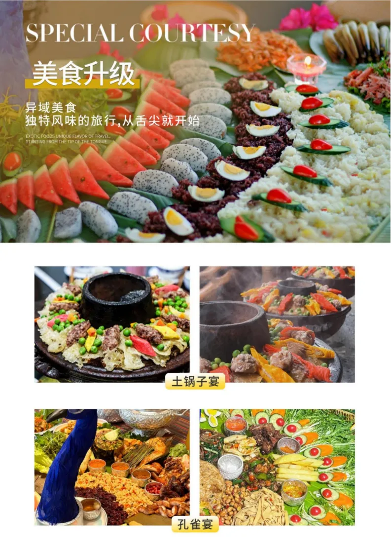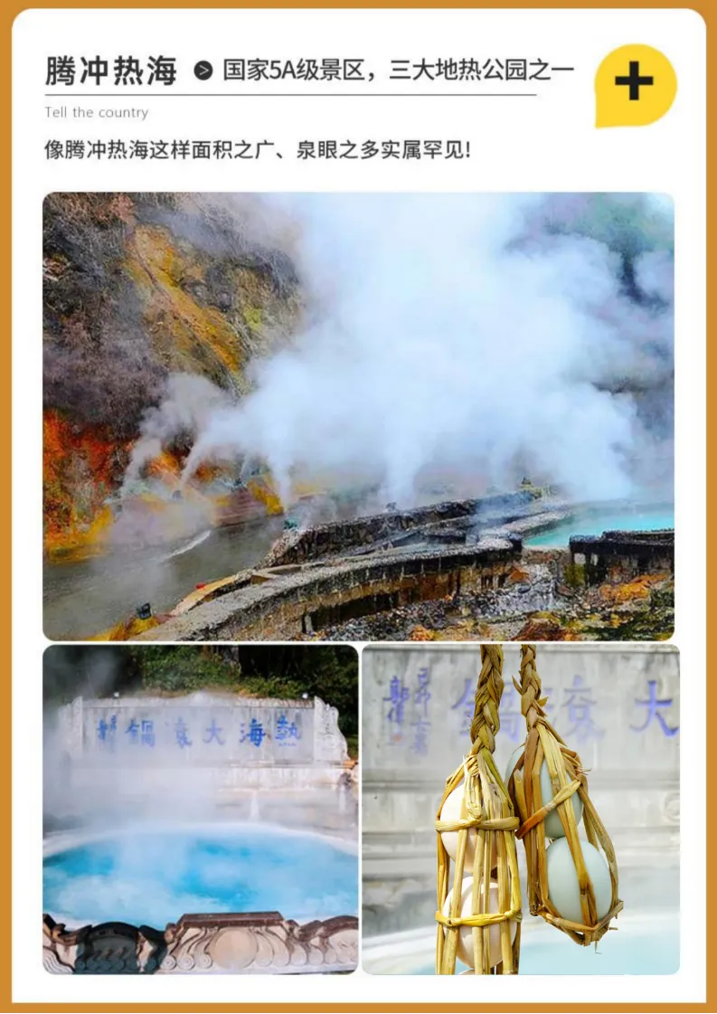 早餐后游览【姐告国门】,中缅国门,天涯地角拍影留念。中缅姐告国门口岸为国家级的边贸口岸,是中国对缅贸易陆路通道最繁忙的地区之一,国门对面是缅甸木姐镇。姐告口岸分为三座宏伟建筑,依边境而建,中间为主国门,右边为货物通道,左边为人员通道。 乘车前往游览【一寨两国】,这里有着一寨两国,一桥两国,一井两国,一塔两国,一秋荡两国,1950年周恩来总理到此定下了中缅71 号界碑,为中缅两国边界及胞波情怀奠定了世代友好基础,互利共赢的历史性意义。 后前往游览国家AAAAA级景区,三大地热公园之一的——【热海公园】(含电瓶车)游览大滚锅,在这里你会亲眼看到云南十八怪之鸡蛋拴着卖,蛤蟆嘴、珍珠泉、姐妹泉,怀胎井等地热奇观(游览约 2 小时)。(小提示 :热海景区到处都是地热高温喷泉 ,不可随意用手试探水温哦,最好的拍照地点为蛤蟆嘴、大滚锅。) 游览结束后,前往享用晚餐,晚餐后入住云峰山温泉酒店休息(自带泳衣,享受温泉)。 |