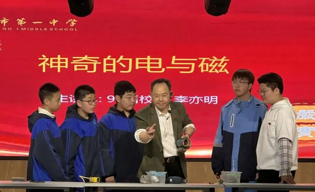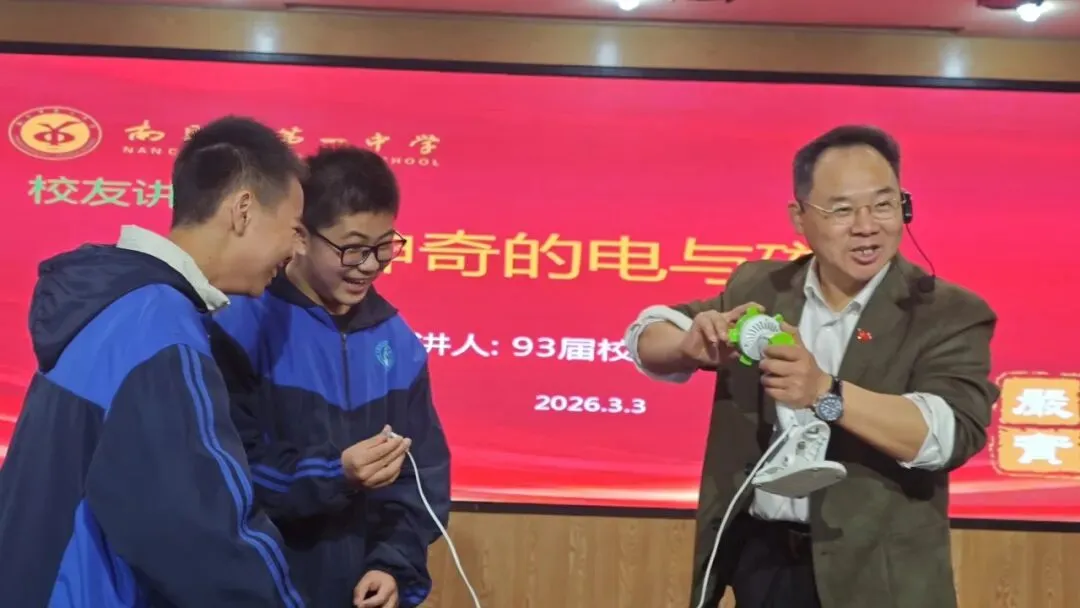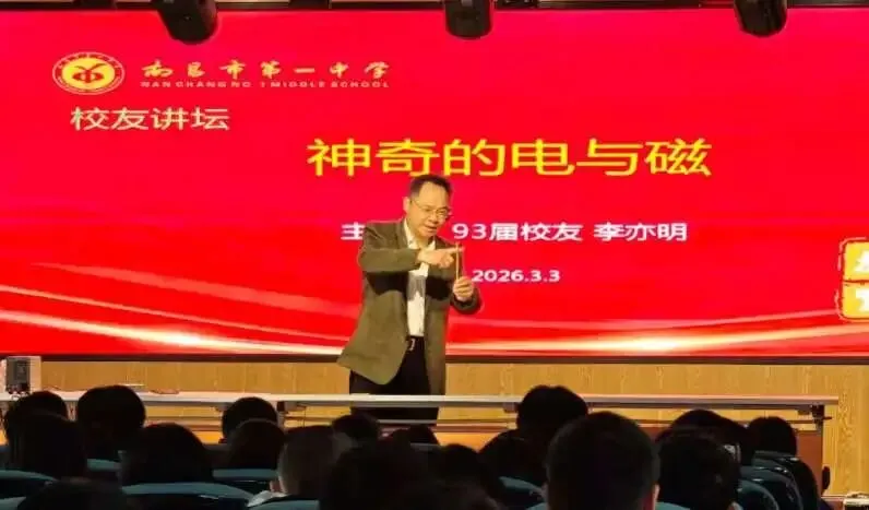 3月3日下午,南昌一中孺子校区五楼报告厅内热闹非凡,南昌一中93届校友、江西省政协委员、民盟江西省委常委李亦明教授给八年级学子带来的“神奇的电与磁”公益科普讲座在此精彩开讲。李亦明教授还是江西省民盟“烛光行动”科普讲堂负责人和南昌一中校友会公益部负责人,本次他以“校友+公益人”的双重身份,为学子们带来了一堂妙趣横生、干货满满的科学探究课,用一场跨越二十载的“科学之约”,深刻诠释了教育报国的赤子情怀。南昌一中教育集团党委委员郭海燕、孺子校区执行校长李猛、南昌一中校友会会长吴蔚参加了此次活动。活动由校友会秘书长徐毅主持。