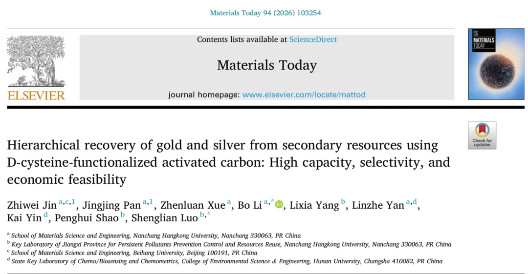 南昌航空大学李波和罗胜联教授开发了一种用手性氨基酸修饰的环保型椰壳活性炭,用于贵金属回收。D-半胱氨酸修饰的活性炭(AC-(D)SH)对Au(III)和Ag(I)表现出极高的吸附容量,分别为3783.8 mg/g和2076.6 mg/g,并具有显著的可再生性和优异的选择性。AC-(D)SH 能够从废弃CPU和废旧太阳能电池板中分别回收高纯度的Au和Ag,并实现了从铜阳极泥中分步回收Au/Ag。