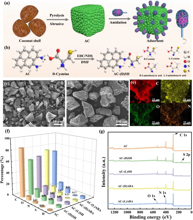 为了开发具有卓越回收性能的吸附剂,使用不同的氨基酸对椰壳AC进行了修饰。合成过程如图1a所示。D-半胱氨酸、L-半胱氨酸、D-2-氨基丁酸和L-2-氨基丁酸通过酰胺化反应直接接枝到AC上(图1b),分别形成AC-(D)SH、AC-(L)SH、AC-(D)ABA和AC-(L)ABA。作者通过SEM、EDS、元素分析、XPS、FTIR光谱、TGA和接触角对所制备材料的结构和形貌进行了表征。