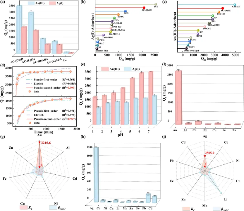 Fig. 2. (a) Maximum Ag(I)/Au(III) adsorption capacities of AC, AC-(L)SH, AC-(L)ABA, AC-(D)SH, and AC-(D)ABA. Comparison of the maximum adsorption capacities of Au(III) (b), and Ag(I) (c) for AC-(D)SH with those of reported adsorbents. (d) Adsorption kinetic results of AC-(D)SH for Au(III) (upper panel) and Ag(I) (lower panel) fitted by pseudo-first-order, pseudo-second-order, and Elovich models. (e) Adsorption capacities of AC-(D)SH for Ag(I)/Au(III) at different pH (f) Selectivity of AC-(D)SH for Au(III) (initial concentration: 2 g/L). (g) K d (initial concentration: 1 g/L). (i) K d and β of AC-(D)SH for Au(III) and multiple cations. (h) Selectivity of AC-(D)SH for Ag(I) ◦ and β of AC-(D)SH for Ag(I) and multiple cations. Experimental conditions: dosage = 0.4 g/L, temperature = 30 ℃,initial concentration: 2 g/L for Au(III), 1 g/L for Ag(I), pH = 7 (except Fig. 2e).)
