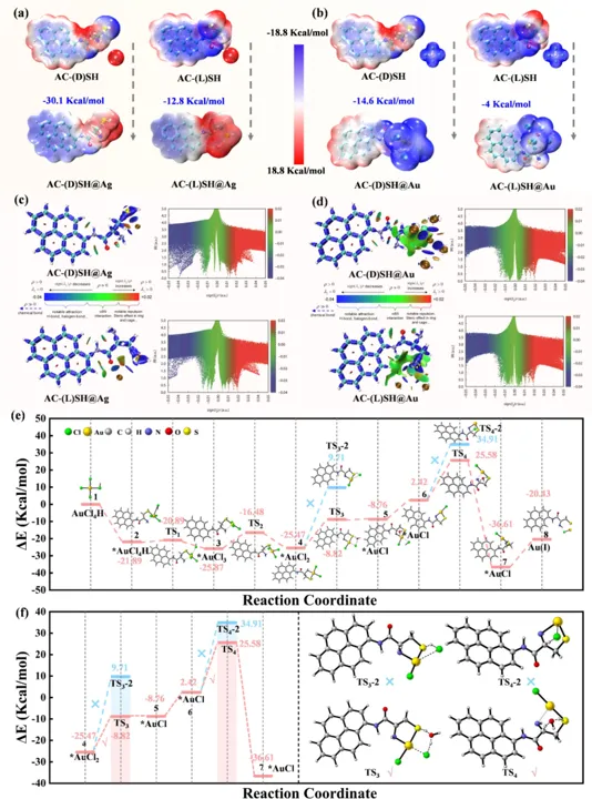 通过相互作用区域指示函数(IRI)进一步分析了Au(III)/Ag(I)与AC-(D)SH之间的相互作用机制。IRI等值面和散点图如图5c-d所示。不同颜色的区域表示不同的相互作用类型(浅蓝色:氢键;绿色:范德华力;红色:空间位阻;深蓝色:化学键)。与AC-(L)SH相比,AC-(D)SH在吸附Au(III)/Ag(I)后形成了更稳定的化学键,使其更有利于Au(III)/Ag(I)的吸附。D-半胱氨酸中官能团的空间排列为Au(III)和Ag(I)提供了最佳的配位几何结构。因此,AC-(D)SH与这些金属离子形成的化学键比AC-(L)SH更稳定,赋予其对Au(III)和Ag(I)更有利的吸附亲和力。作者进一步通过DFT解释了[AuCl₄]⁻在吸附过程中脱氯和还原机理。结果表明,水分子在AC-(D)SH吸附过程中促进了[AuCl₄]⁻的脱氯和还原。