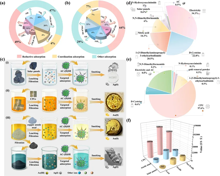 Fig. 6. Contribution ratios of both mechanisms and functional groups to (a) Ag(I) and (b) Au(III) capacity. (c) Schematic of the Ag recovery from SPs (i), Au recovery from CPUs (ii), and cascading Au/Ag recovery from CAM using AC-(D)SH (iii). Cost breakdown of (d) Ag recovery from SPs, (e) Au recovery from CPUs. (f) Economic analysis of the Ag and Au recovery from SPs, CPUs, and CAM.
