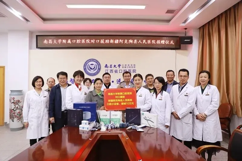 11月9日下午,南大口腔医院向江西对口援助的新疆阿克陶县人民医院捐赠仪式在十一楼会议室举行,该院援疆医师、预防科副主任医师万莉作为江西省第十批援疆专业技术人才,代表阿克陶县医院接受了口腔医院捐赠的价值约10万元的医疗器械和书籍。我院领导廖岚、陈美华、严晓兰、李志华及职能科室负责人参加了捐赠仪式。