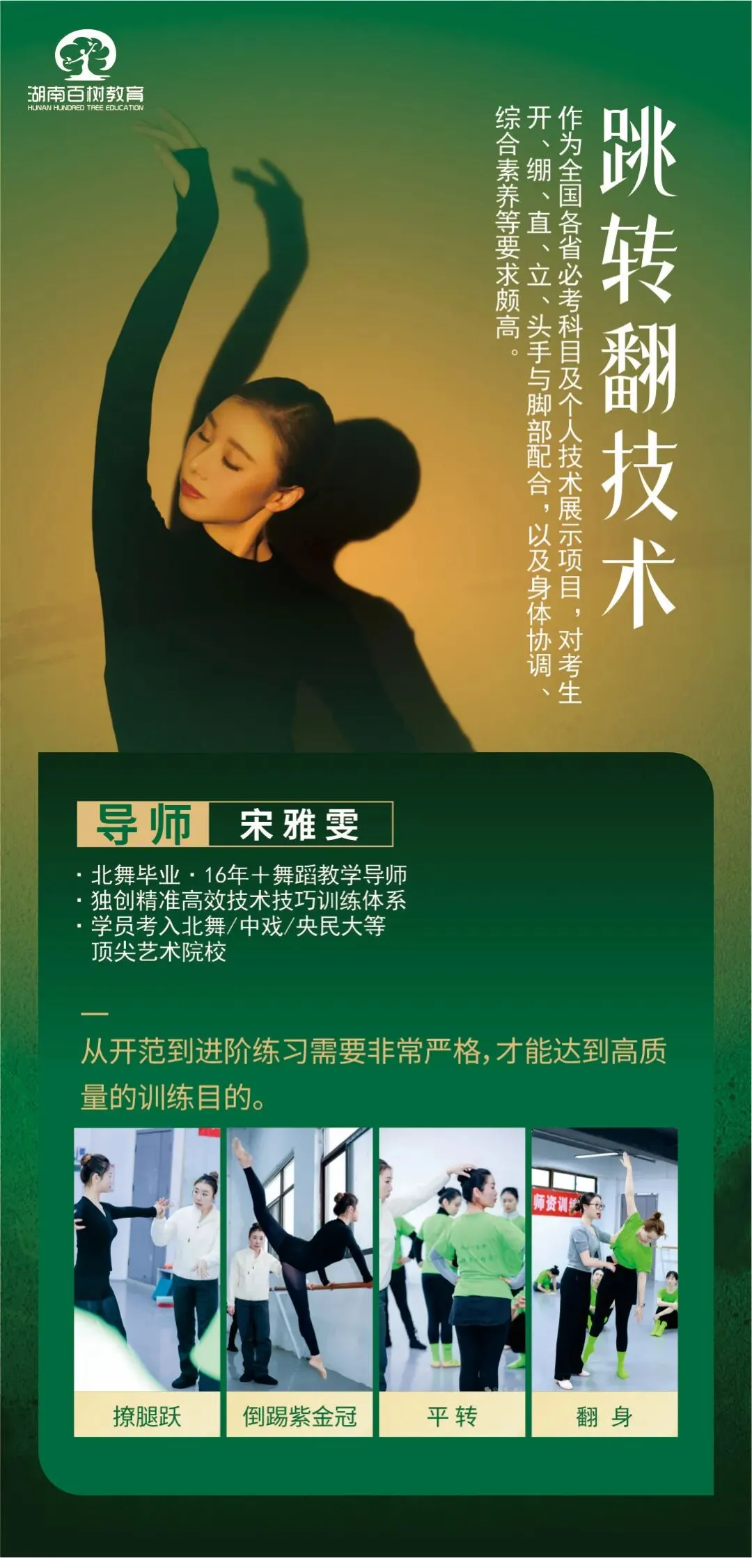跳转翻技术:作为全国各地省份的必考科目以及个人技术展示项目,对考生的开、绷、直、立、头及手脚的配合、乃至整个身体协调能力、综合素质能力等都有很高的要求。