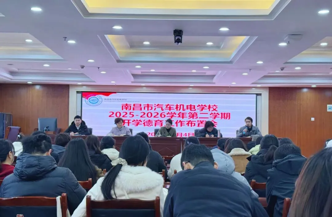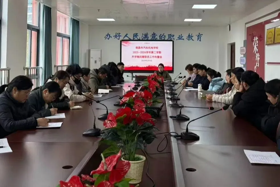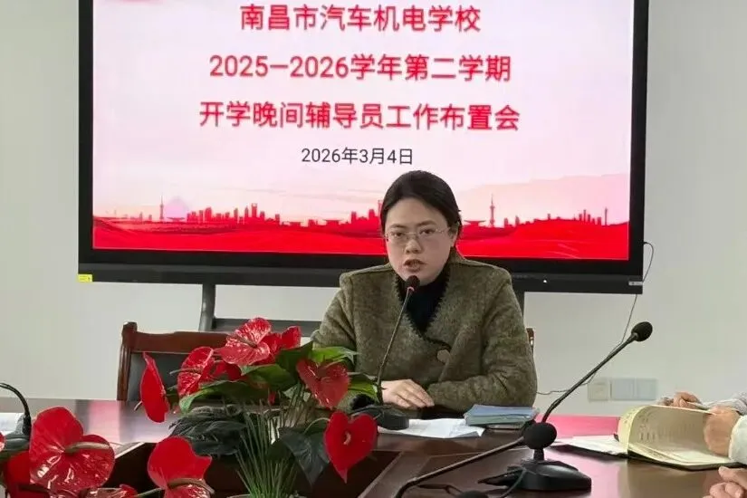 2026年3月4日上午9:00,南昌市汽车机电学校在经开校区正德楼六楼会议室召开2025-2026学年第二学期开学德育工作布置会。会议分为两个阶段,围绕新学期德育工作的重点任务展开系统部署,旨在明确方向、凝聚共识,推动德育实践走深走实。校党委委员、副校长张敏、相关处室负责人及全体班主任参加会议,会议由政教处主任裘华主持。