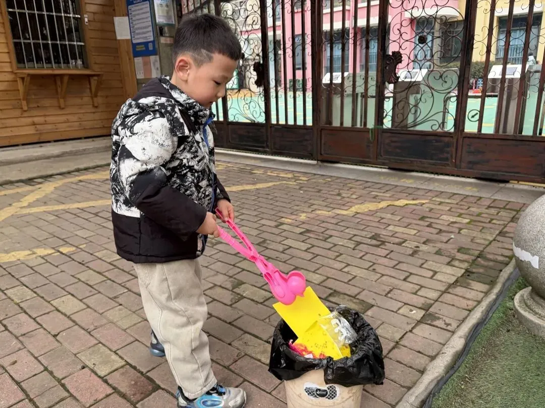 有的拿着抹布,细心擦拭滑滑梯、楼梯扶手。还有的跟着老师走出校门,弯腰捡拾路边垃圾,用行动美化周边环境。