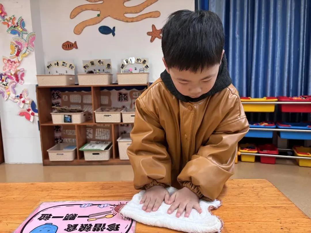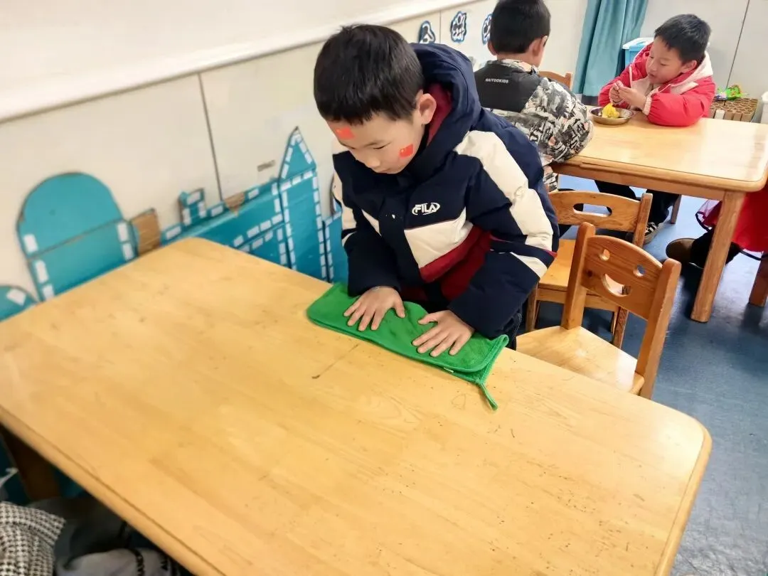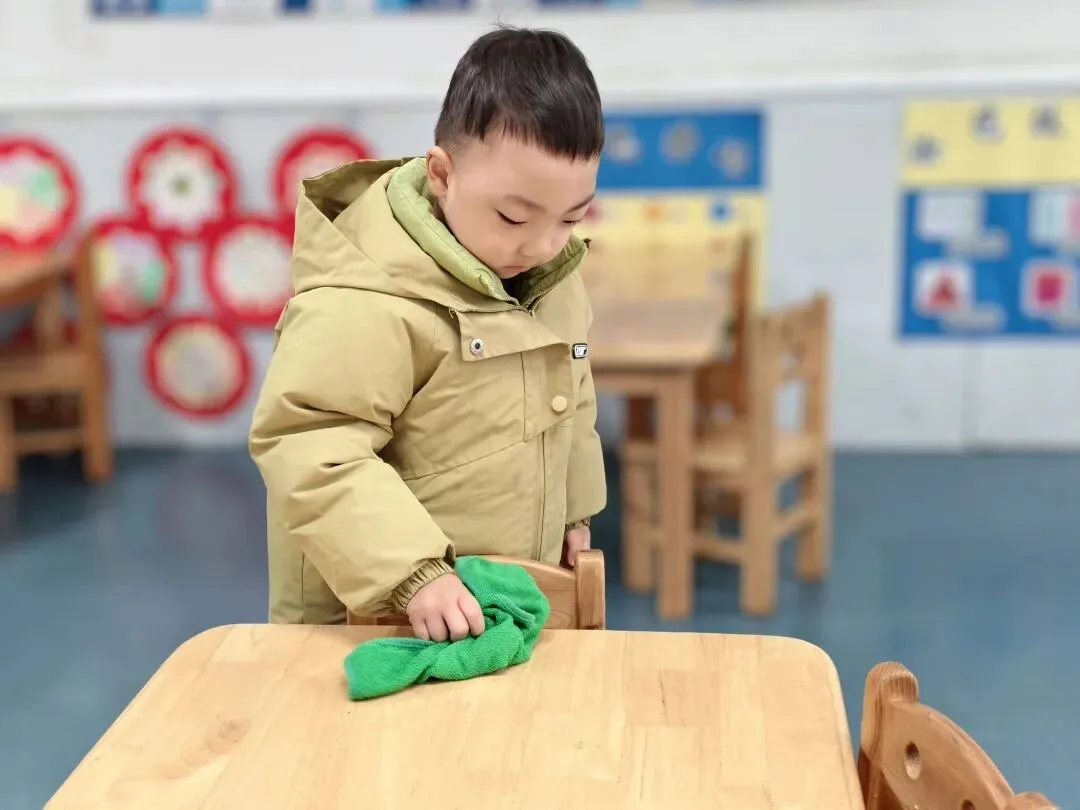 教室里,大家争当勤劳值日生,擦桌、扫地、整理玩具,忙得不亦乐乎。