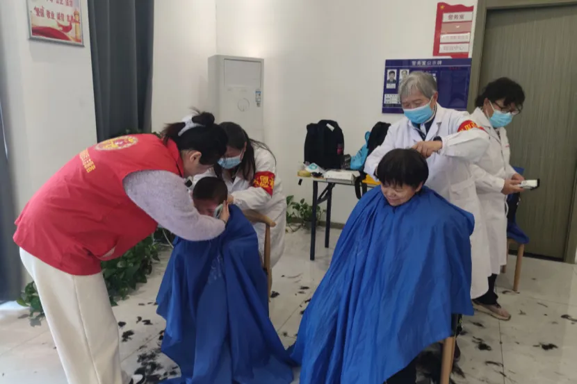 莲塘街道河滨路社区联合南昌市红十字捐献志愿服务队开展免费理发志愿服务活动,为辖区居民送上暖心便民服务。