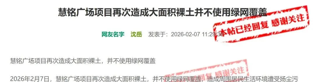 近日,有网友在问政江西留言平台留言:慧铭广场项目再次造成大面积裸土并不使用绿网覆盖。