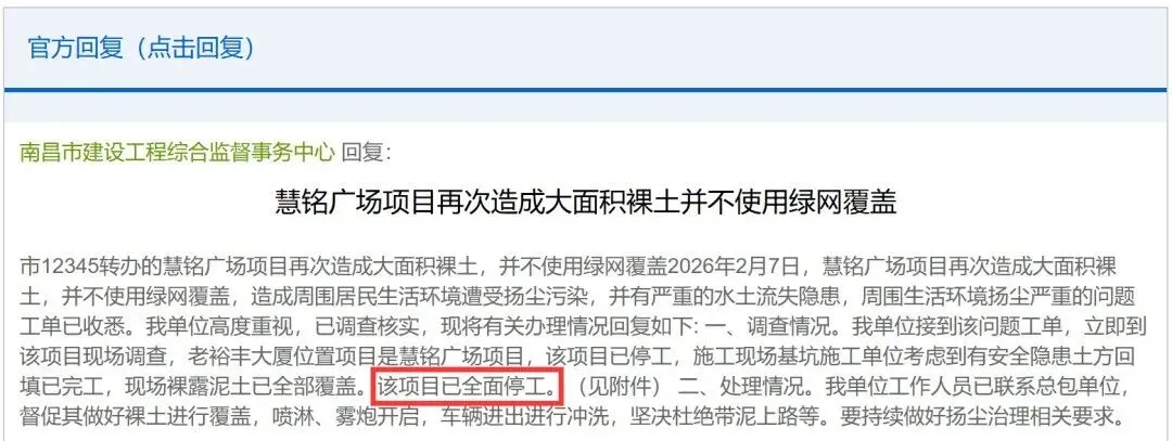 南昌市建设工程综合监督事务中心回复:老裕丰大厦位置项目是慧铭广场项目,该项目已停工。