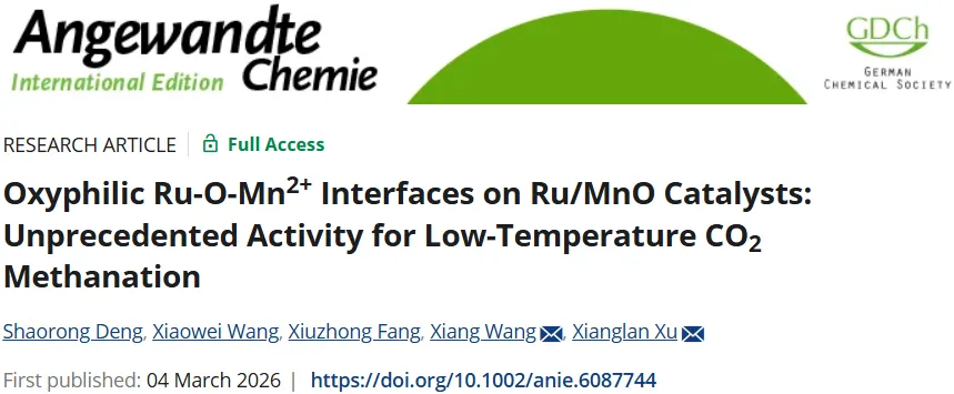 2026年03月04日,南昌大学徐香兰、王翔团队在Angewandte Chemie International Edition期刊发表题为“Oxyphilic Ru-O-Mn2+ Interfaces on Ru/MnO Catalysts: Unprecedented Activity for Low-Temperature CO2 Methanation”的研究论文,团队成员Deng Shaorong为论文第一作者,徐香兰、王翔为论文共同通讯作者。
