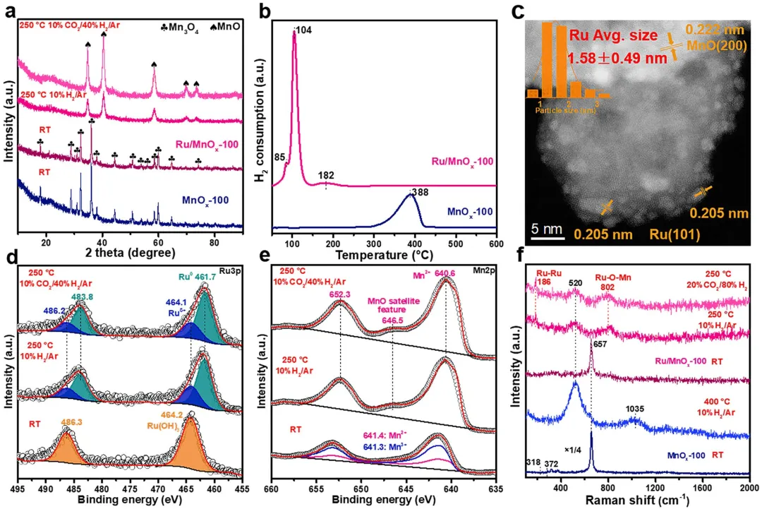 图2 (a) MnOₓ-100和Ru/MnOₓ-100在指定条件下的原位XRD图谱;(b) MnOₓ-100和Ru/MnOₓ-100的H₂-TPR曲线;(c) Ru/MnOₓ-100的AC-HAADF-STEM图像及Ru平均粒径;Ru/MnOₓ-100的准原位(d) Ru 3p,(e) Mn 2p XPS光谱;(f) MnOₓ-100和Ru/MnOₓ-100在指定条件下的原位Raman光谱。
