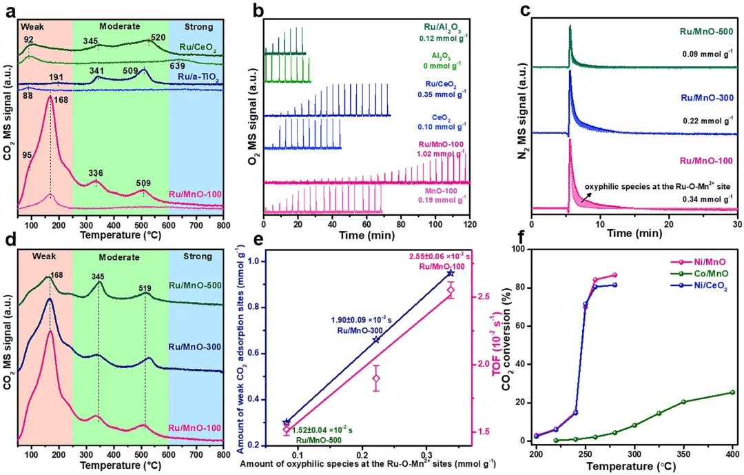 图3 (a) Ru/MnO-100、Ru/CeO₂和Ru/Al₂O₃催化剂及其对应载体的CO₂-TPD曲线;(b) Ru/MnO-100、Ru/CeO₂和Ru/Al₂O₃催化剂及其对应载体的O₂-pulse曲线;(c) 通过差示N₂O滴定测定的Ru/MnO催化剂上界面亲氧物种的定量。测量是在CO₂饱和吸附并随后在50°C(虚线)或200°C(实线)下Ar吹扫后进行的;(d) Ru/MnO催化剂的CO₂-TPD曲线;(e) 界面亲氧物种数量、弱CO₂吸附位点数量与160°C下TOF之间的相关性;(f) Ni/MnO、Co/MnO和Ni/CeO₂催化剂上的CO₂甲烷化转化曲线。