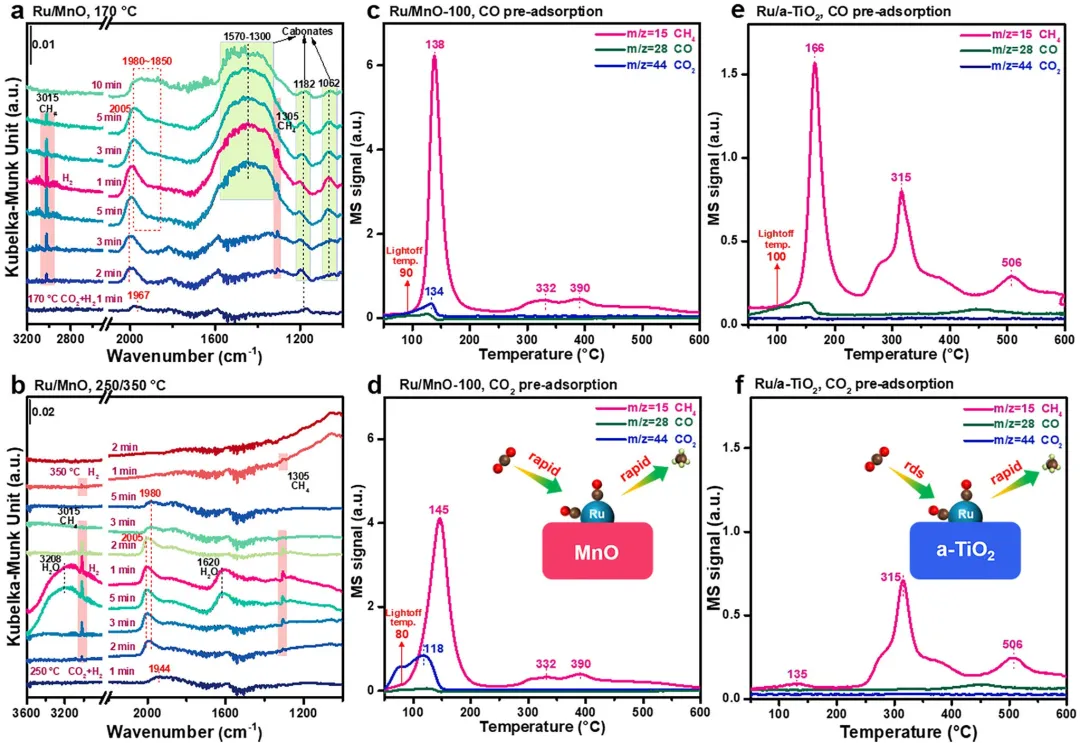 图4 在Ru/MnO-100上,于(a) 170°C和(b) 250/350°C条件下,在20%CO₂/80%H₂随后切换为10%H₂/Ar的进料气中记录的瞬态原位DRIFTS;在(c,d) Ru/MnO-100或(e,f) Ru/a-TiO催化剂上,于50°C用4%CO/He或纯CO₂流预处理后,在10%H₂/Ar气流中的TPSR-MS曲线。