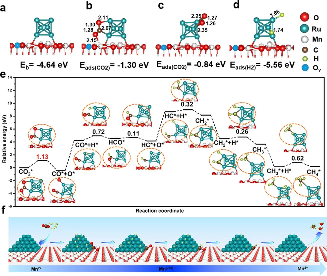 图5 (a) Ru₆/MnO-Ov的结合能;(b,c) CO₂吸附时与界面Ru和Mn位点成键及不成键的情况;(d) H₂的吸附;(e) Ru₆/MnO-Ov上最优CO₂甲烷化路径,标注了每步的活化能(eV);以及(f) 亲氧性Ru-O-Mn²⁺界面在CO₂甲烷化中的关键作用。