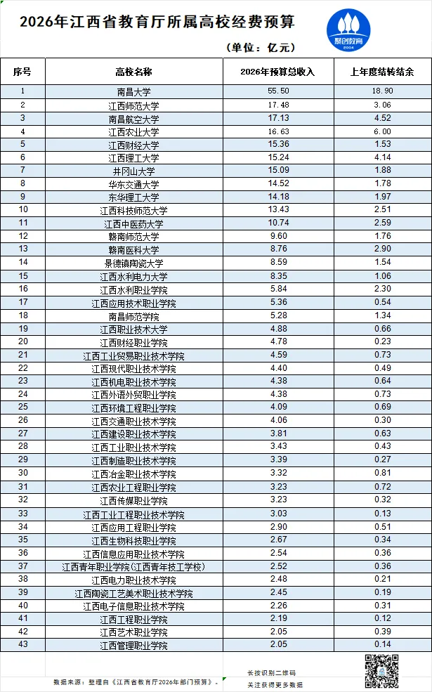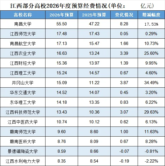 2026年江西高校预算整体有所增加,显示对教育的重视程度进一步增加。预算增加最多的高校是南昌大学,增加了8.28亿,其次是井冈山大学增3.87亿、江西农业大学增3.39亿、江西科技师范大学增3.07亿。