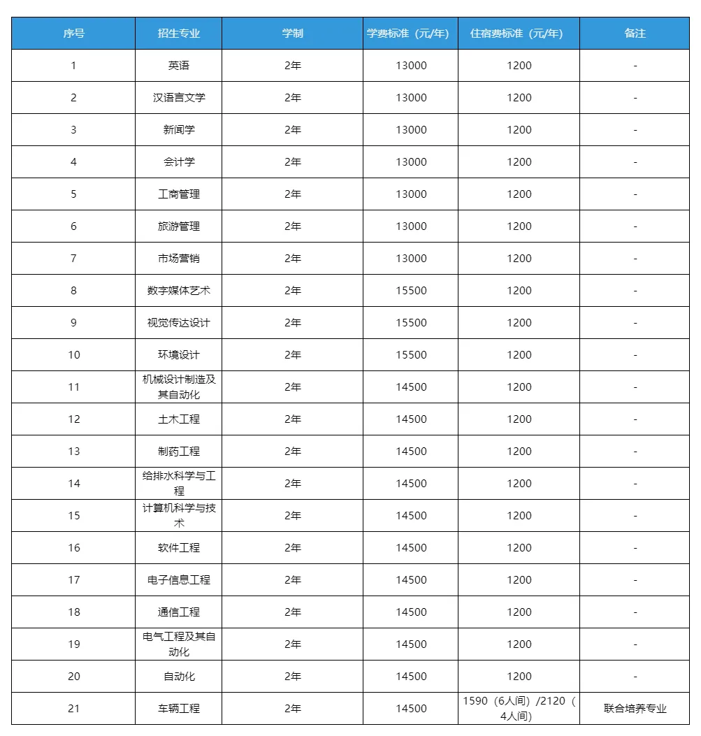 专升本学生与统招本科生享受同等待遇,按所录取专业的学费和住宿费标准缴纳相关费用,具体收费标准如下: