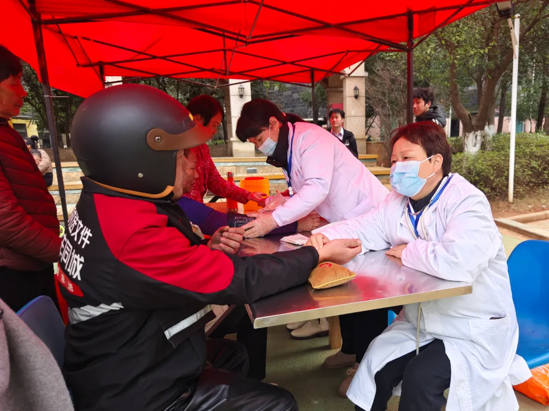 健康义诊送关爱,国医传承中医馆的管医生正耐心为外卖小哥测量血压、血糖。“我们平时送餐忙,饮食不规律,颈椎腰椎也常有不适,今天能免费咨询中医理疗,真是太好了!”一位刚测完血糖的骑手连连称赞。