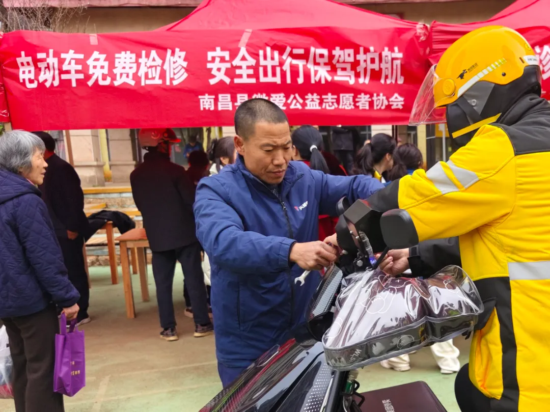 电动车免费检修摊位前,陈师傅正熟练地为骑手们调试刹车、充气加固。“电动车是我们的‘吃饭家伙’,平时有点小毛病也没时间修,今天陈师傅帮我检查了一遍,骑起来安心多了。”网约车司机王师傅笑着说。