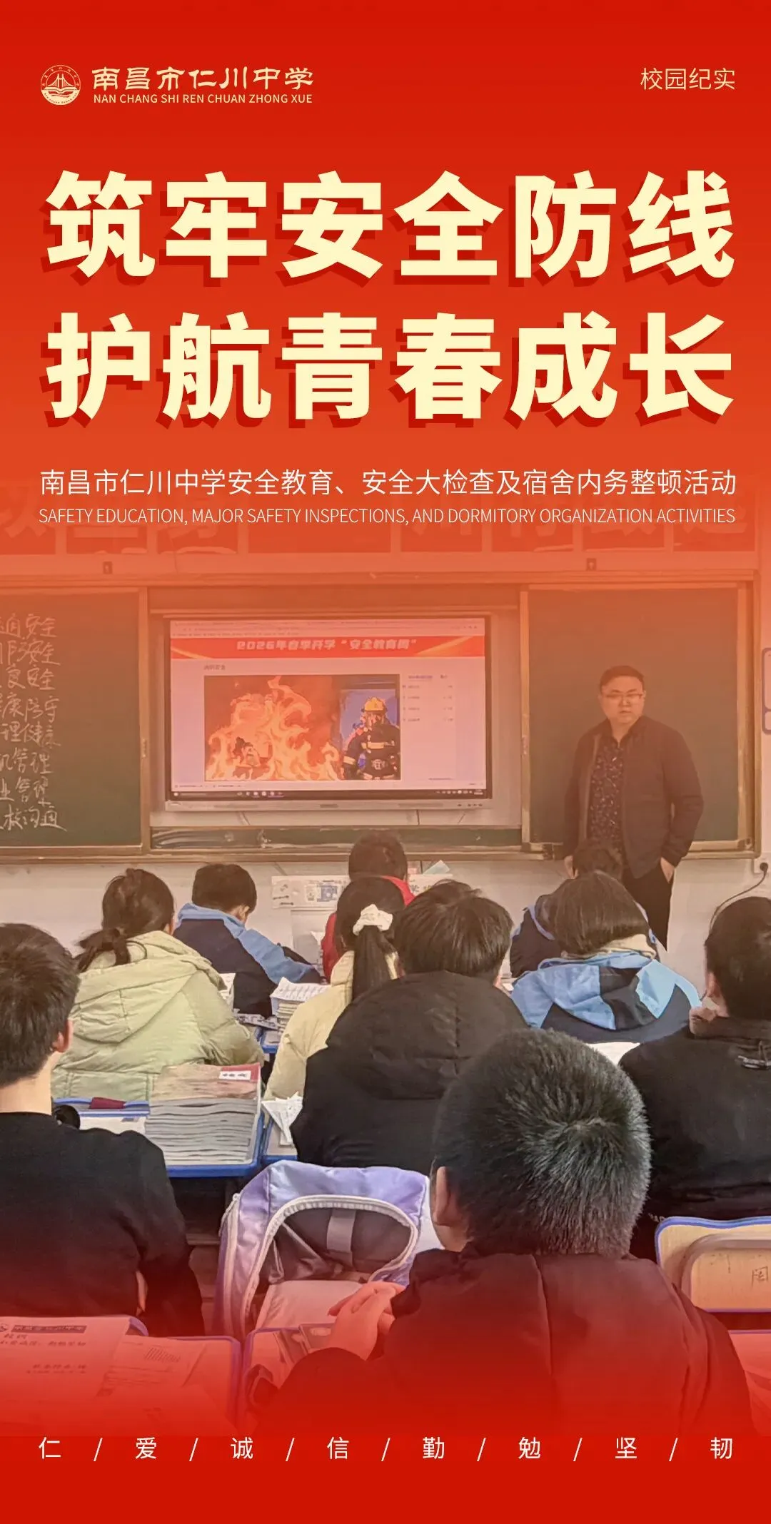 安全工作没有休止符,只有进行时。未来,南昌市仁川中学将持续常态化开展安全教育、安全检查及内务整顿工作,不断完善校园安全管理体系,凝聚家校社协同合力,用责任与坚守为每一位仁川学子的青春成长,撑起一片安全、和谐、温暖的天空!