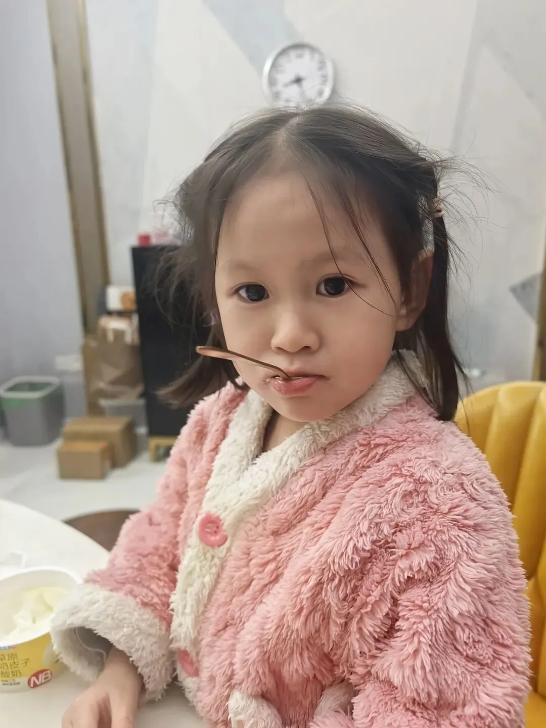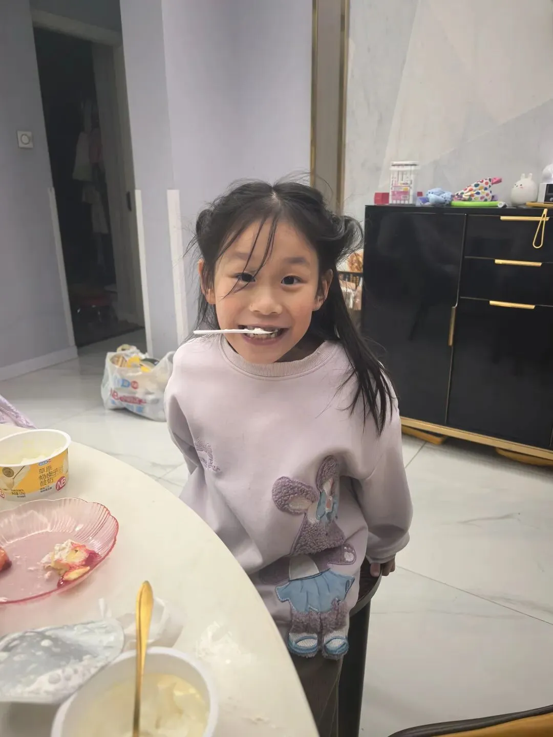 第一天一大早爸爸带姐妹俩出门,头发也没梳、妹妹还一整天穿着睡衣,妈妈心里非常不是滋味,下了班到家带姐妹俩去买零食,给娃儿们梳头、洗漱。