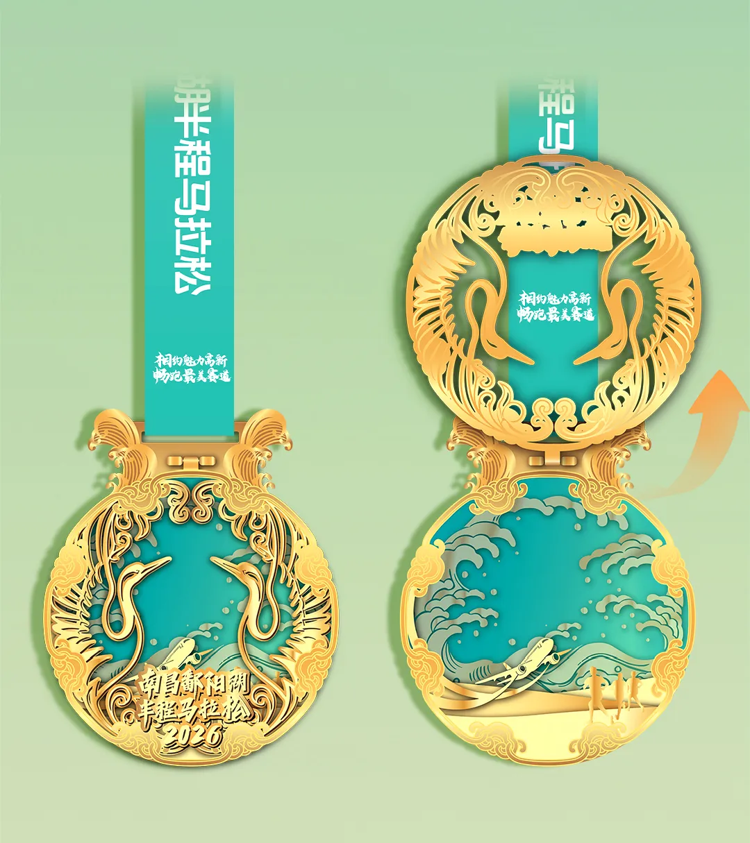 此次大赛奖牌以“科技高新・鹤舞鄱湖”为核心创作理念,深度融合南昌高新区的科创底蕴与鄱湖湿地的生态之美,创新采用上下翻盖结构的赛事奖牌,让每一位完赛选手都能留存属于本次“马年首马”的独特记忆。