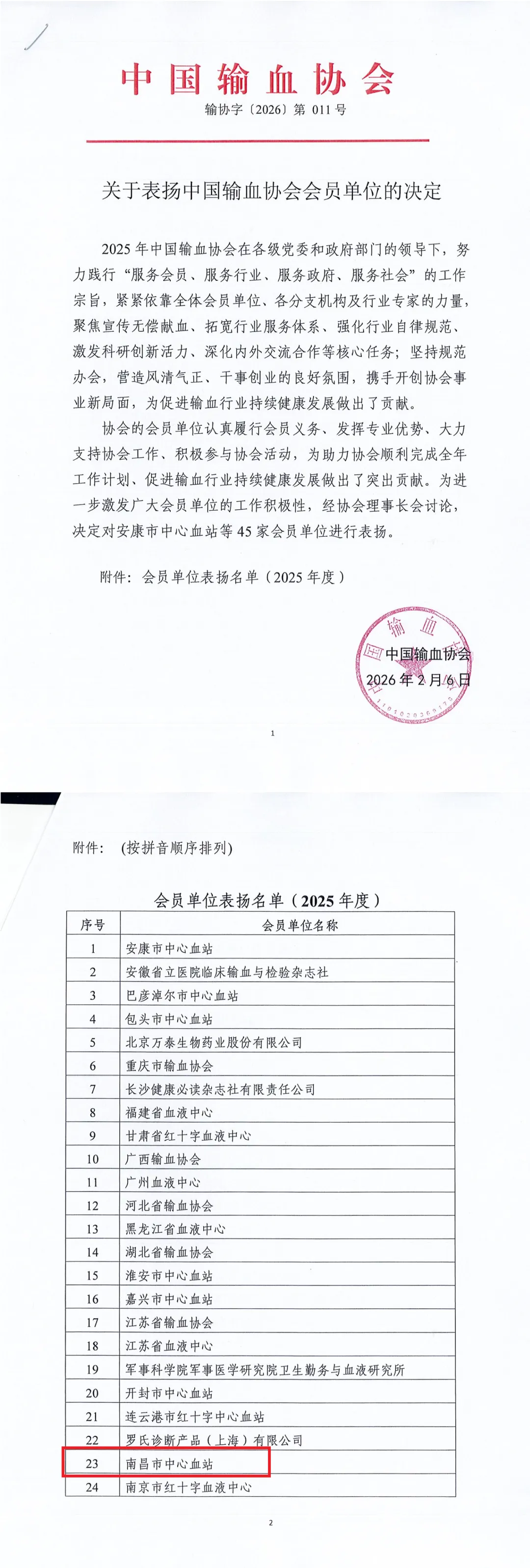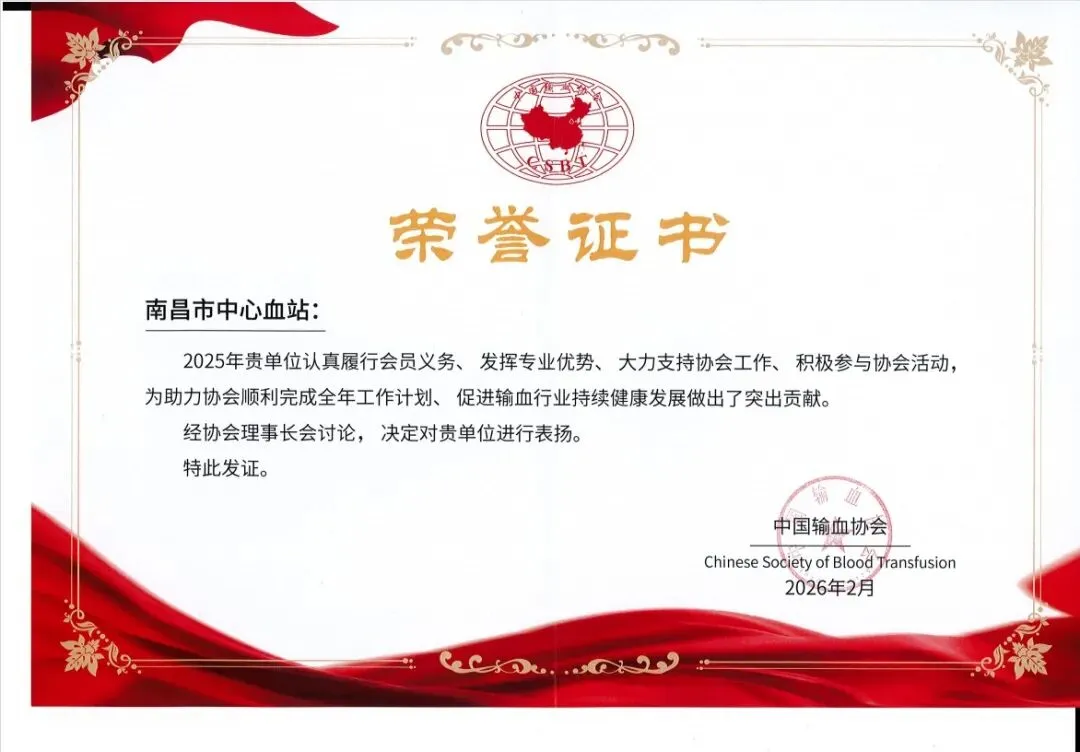 近日,中国输血协会公布2025年度优秀会员单位评选结果,南昌市中心血站凭借扎实的工作作风、突出的行业贡献及对协会工作的全力支持,成功获评“2025年度优秀会员单位”,这份荣誉是行业对血站专业能力与责任担当的高度认可。