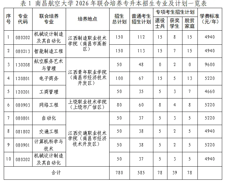 我校2026年联合培养专升本招生计划共计780人,具体情况详见表1。