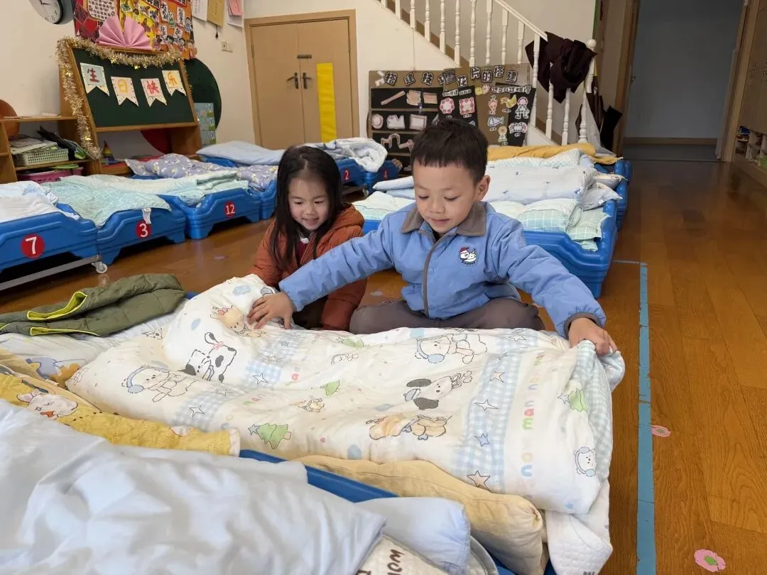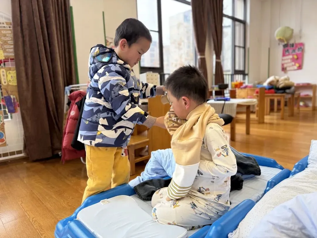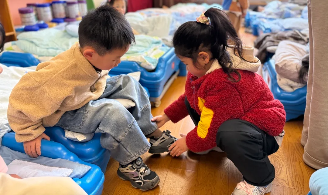 午睡起床后,大班的小朋友主动来到小班,耐心地帮弟弟妹妹穿衣服、整理衣物。他们动作轻轻、态度认真,在一次次动手帮忙中,学会了照顾他人、合作互助,也真切体会到:帮助别人,原来就是最快乐的事。