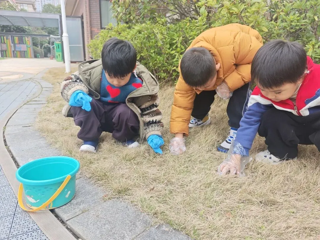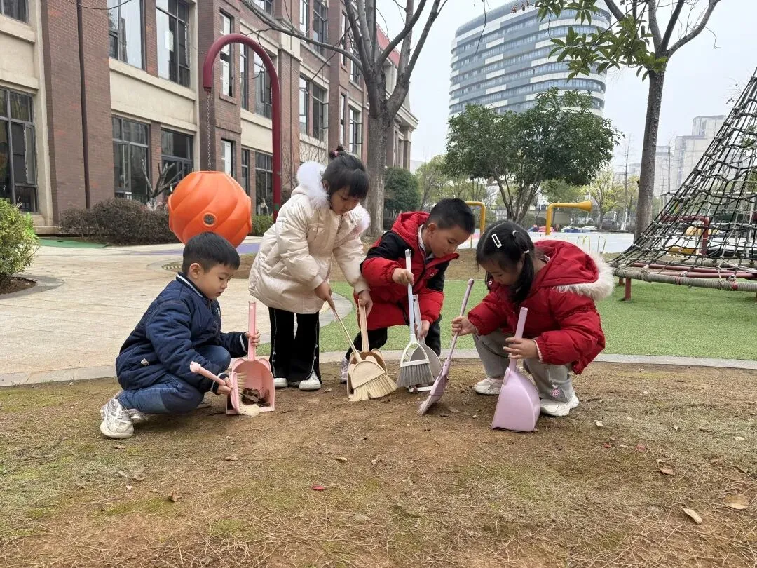 中班的小朋友化身可爱的“环保小卫士”,拿着小工具来到操场,认真捡拾地上的纸屑杂物和落叶。不怕脏、不怕累,大家分工合作、齐心协力,用小小的行动守护美丽校园,在劳动中种下责任与坚持的种子。