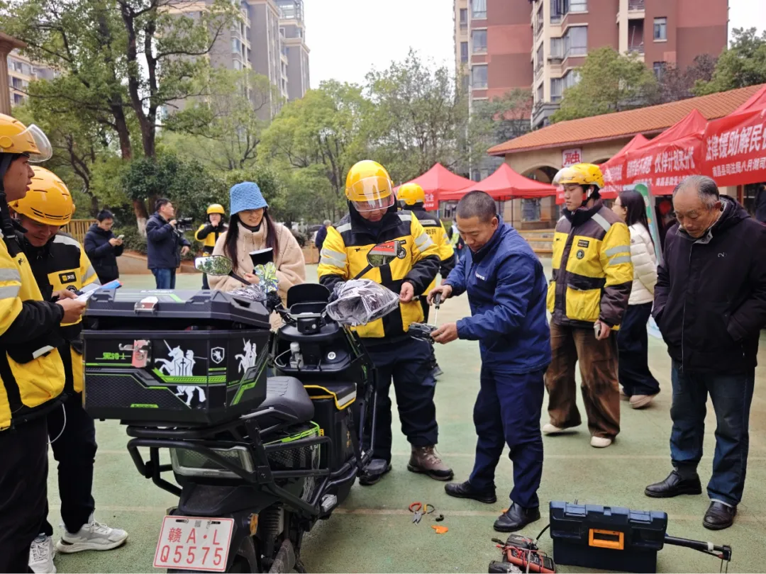 电动车免费检修摊位前,志愿者认真为骑手们调试刹车、充气加固,把好出行安全关。