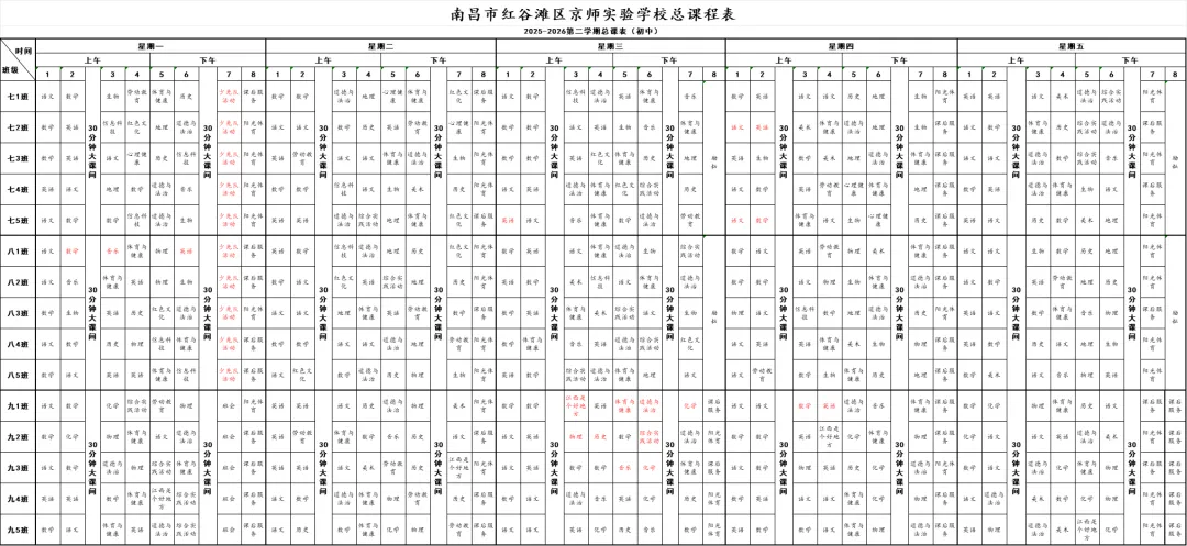 为进一步贯彻落实红谷滩区教育体育局《关于转<江西省教育厅关于开展中小学体育美育“晒课表”的通知>》的文件精神,严格按照国家课程方案和课程标准开齐开足上好体育、美育、劳动教育课,不减少、挤占体育、美育、劳动课课时,使学生掌握更多的运动技能,拥有更多的艺术特长,树立正确的劳动观念。现将我校2025-2026年度下学期课表进行公示,接受社会监督,监督电话:400-688-8292。