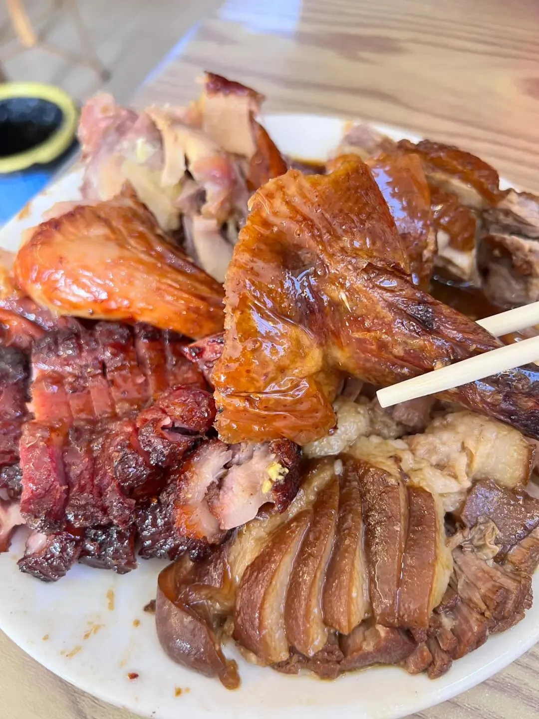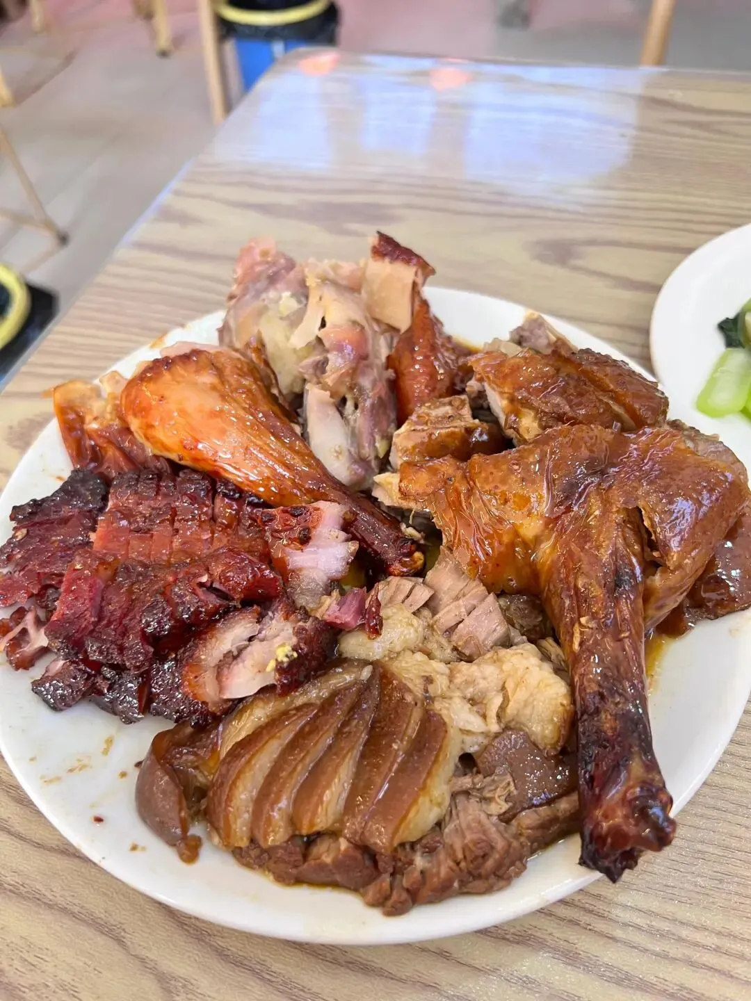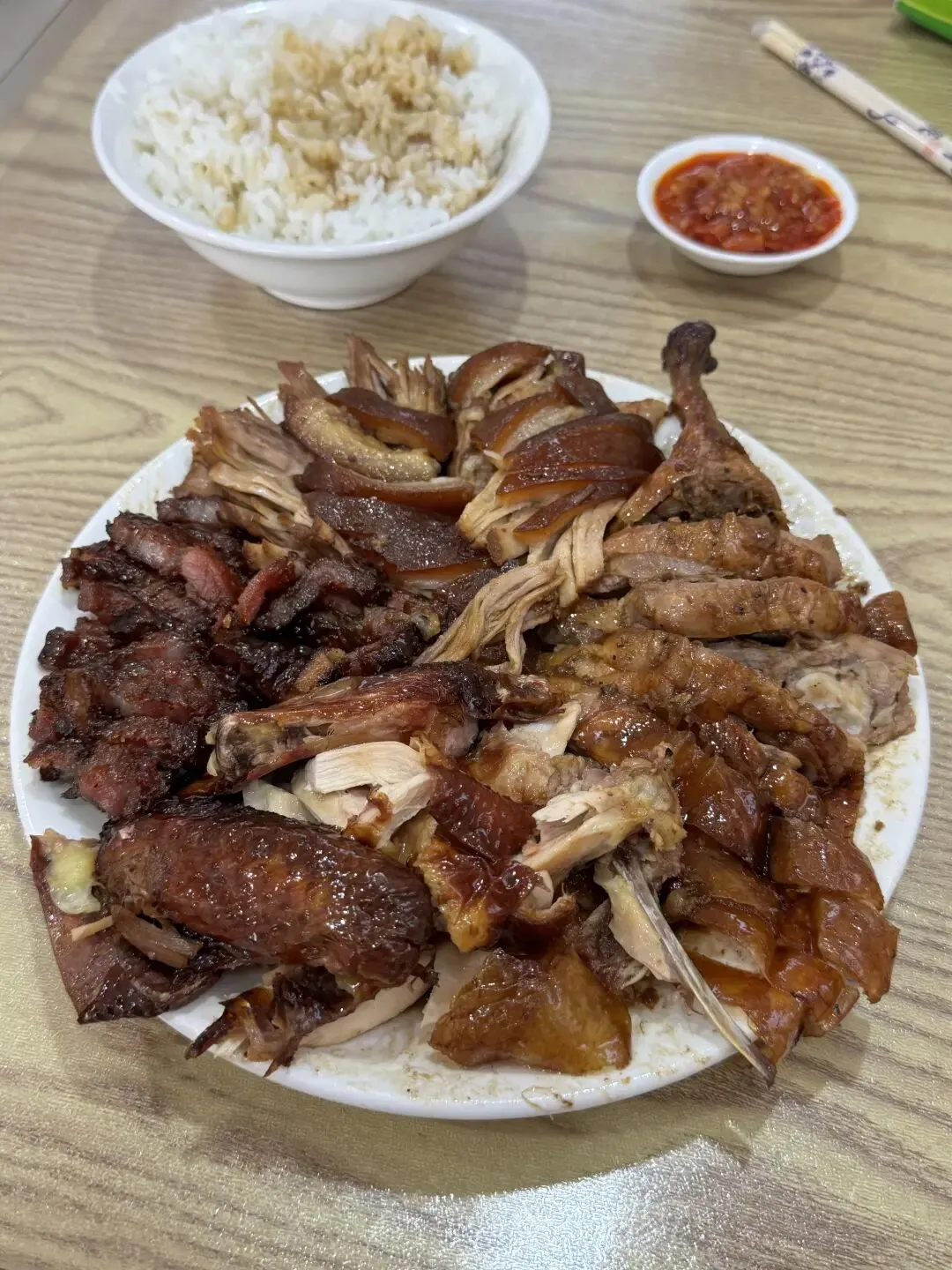 烧腊、烧鸭、猪脚、烧鸡 每一样都好吃,尤其是烧腊 甜甜的好上瘾 猪脚也不错 辣椒酱、小菜、米饭都是免费的,吃好又吃饱👍品类处理的挺好,没有异味,烧鸭烧鸡皮是脆的,猪脚肥而不腻,跟老板说肥瘦相间会更好吃,老板是有水准的,很不错。