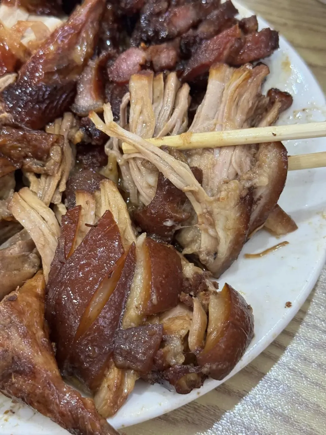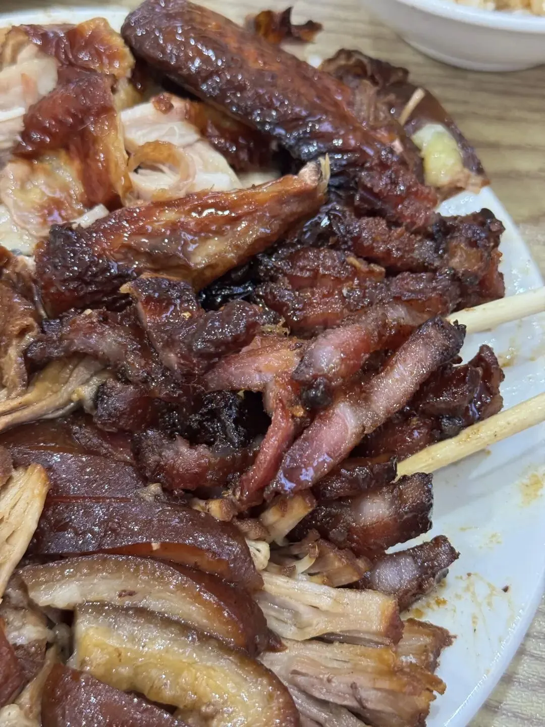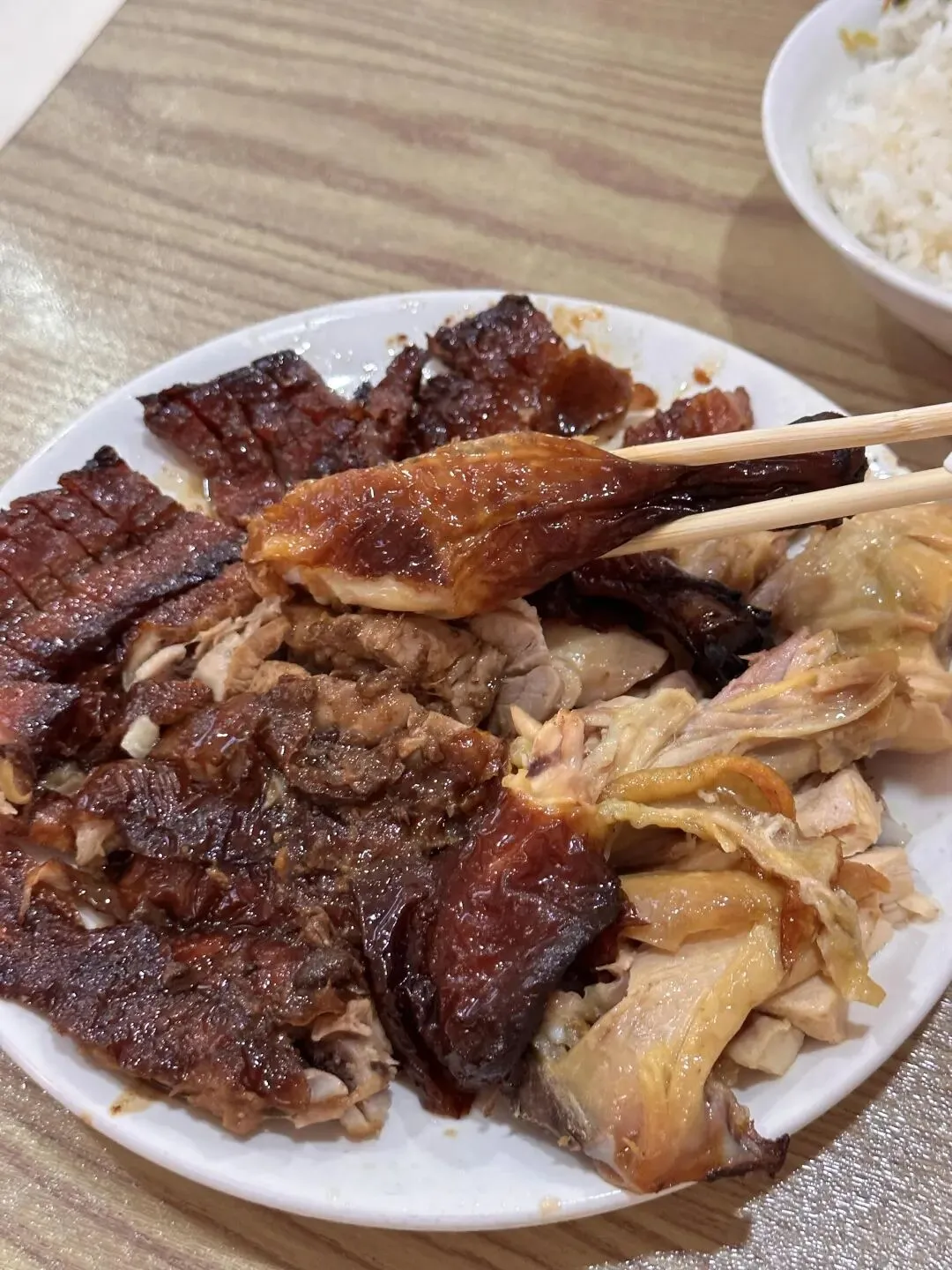 烧腊、烧鸭、猪脚、烧鸡 每一样都好吃,尤其是烧腊 甜甜的好上瘾 猪脚也不错 辣椒酱、小菜、米饭都是免费的,吃好又吃饱👍品类处理的挺好,没有异味,烧鸭烧鸡皮是脆的,猪脚肥而不腻,跟老板说肥瘦相间会更好吃,老板是有水准的,很不错。