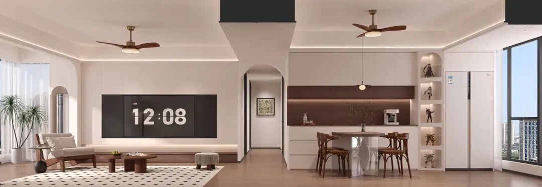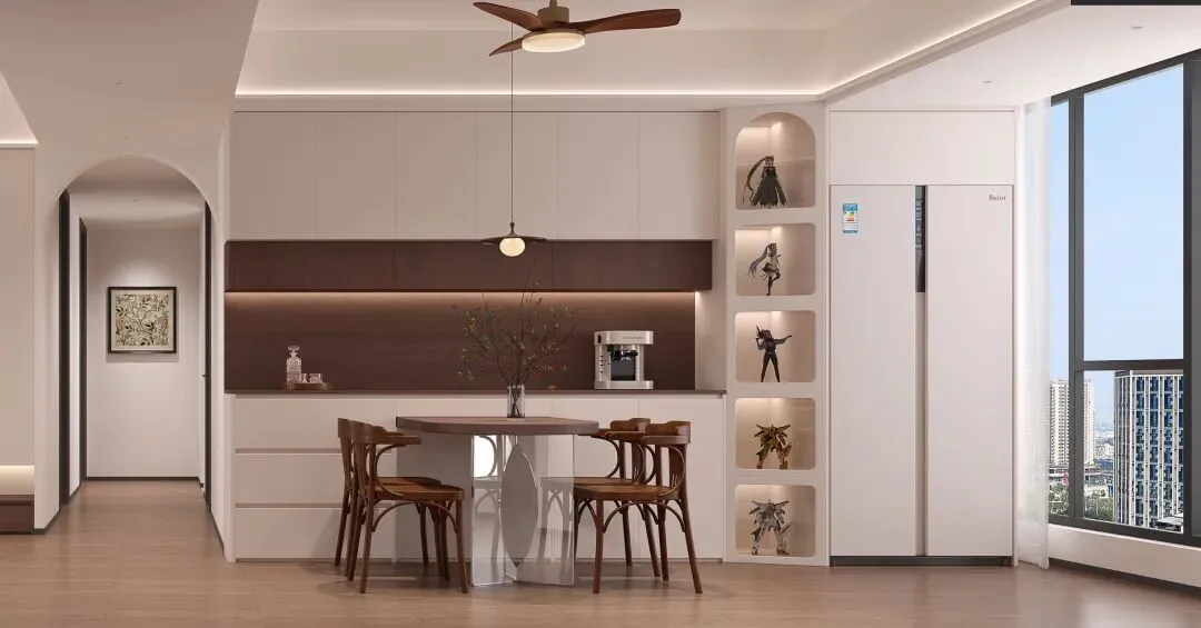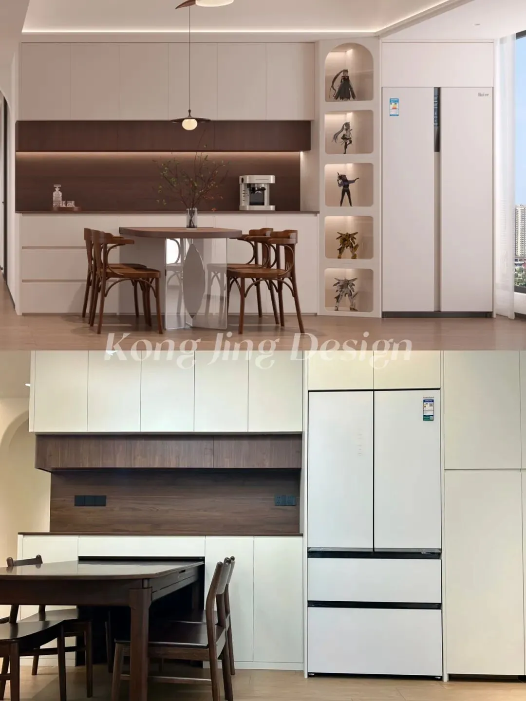 餐边柜和餐桌等区域,使用了深胡桃木色,与浅色墙面形成温暖的对比,增加了空间的层次感和质感。