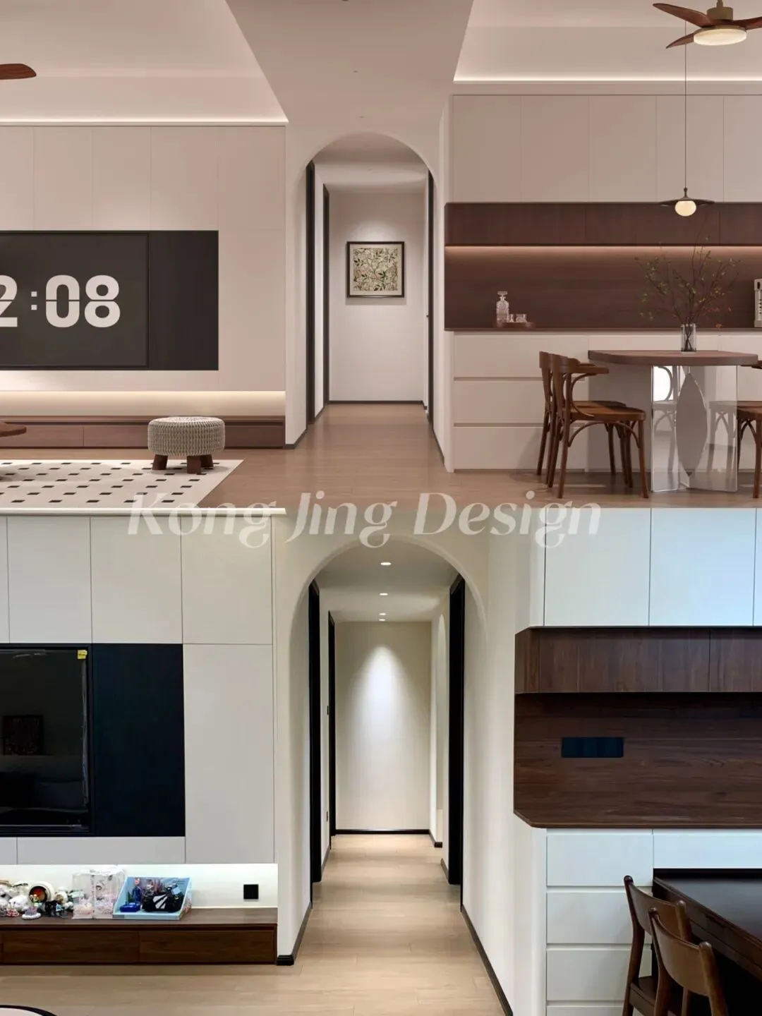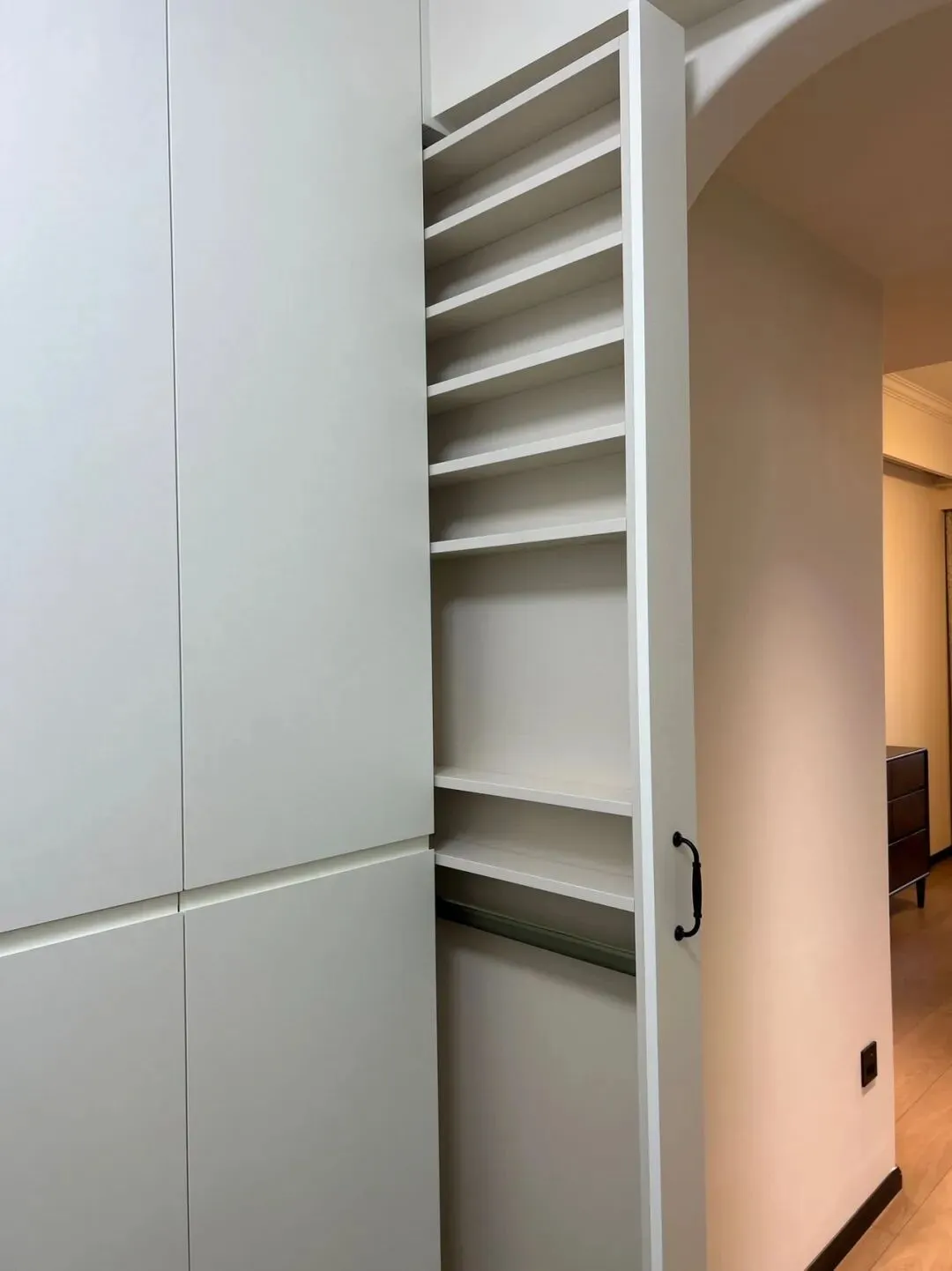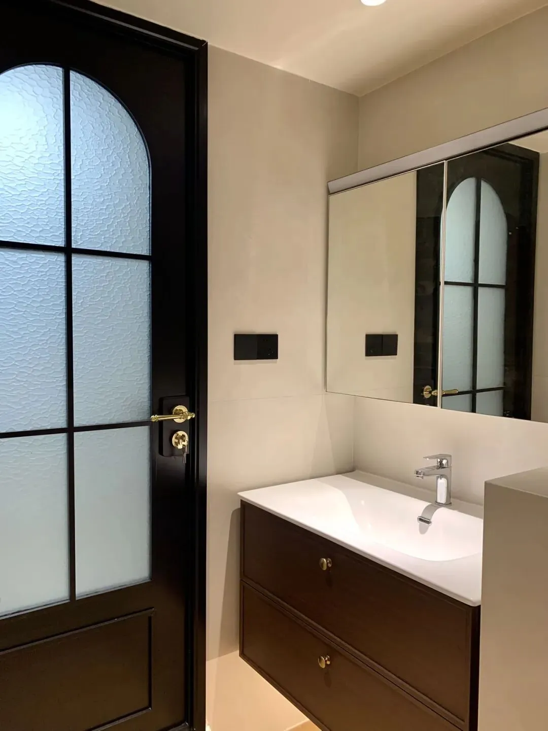 从设计图纸到实景落地,我们实现了近乎1:1的完整复刻。一眼望去,尽头的灯光形成自然的视觉落点,让原本狭长的走廊有了恰到好处的纵深感与故事感,不再是单纯的“过路空间”,而是成为贯穿全屋的颜值中轴线,让每一次归家的动线,都藏着不期而遇的温柔好的居住质感,从来都不止于大空间的惊艳呈现,更藏在每一处容易被忽略的细节里。公卫的入口,也是和全屋风格的第一个呼应点。选用了黑色复古拱形玻璃门,让公卫门不再是空间里的“突兀存在”,而是成为全屋弧形设计语言的延伸。水波纹压花玻璃,既保证了卫生间的隐私性,又能透过柔和的光线,避免小空间的压抑感;搭配亮面金色门锁五金,在细节处守住了风格的统一性。在衣帽间的柜体设计上,我们始终坚持「简洁至上,实用为王」的原则,以温润的原木质感,承载起日常收纳的所有需求,让衣帽间不止能装,更有治愈的温柔质感。